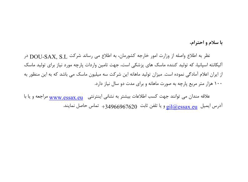 شرکت اسپانیایی مبنی بر خرید پارچه از ایران جهت تولید ماسک ابراز تمایل کرد.