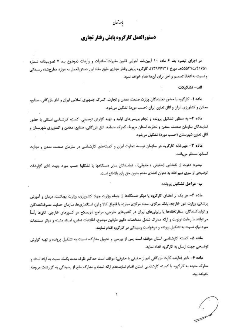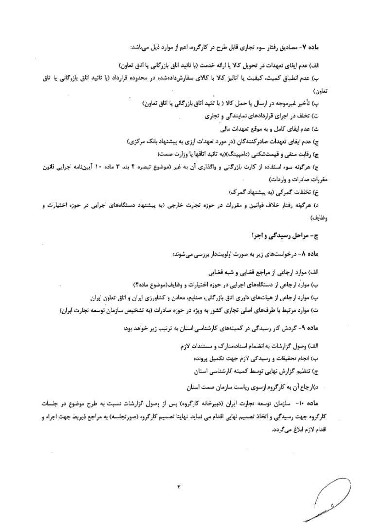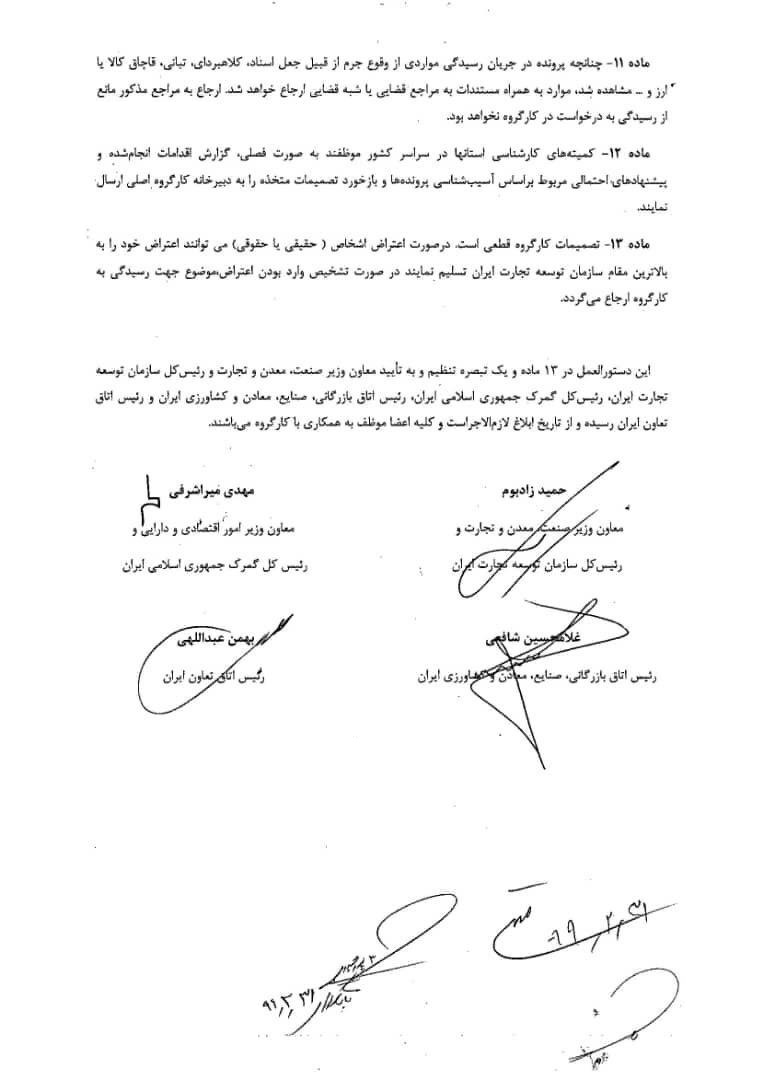 گفتنی است، این دستورالعمل در ۱۳ ماده و یک تبصره تنظیم شده و به تأیید حمید زادبوم، معاون وزیر صنعت، معدن و تجارت و رئیس کل سازمان توسعه تجارت ایران، مهدی میراشرفی، معاون وزیر امور اقتصادی و دارایی و رئیس کل گمرک ج. ا. ایران، غلامحسین شافعی، رئیس اتاق بازرگانی، صنایع، معادن و کشاورزی ایران و بهمن عبداللهی، رئیس اتاق تعاون رسیده و از تاریخ ابلاغ لازمالاجرا است، همچنین کلیه اعضا موظف به همکاری با کارگروه هستند.