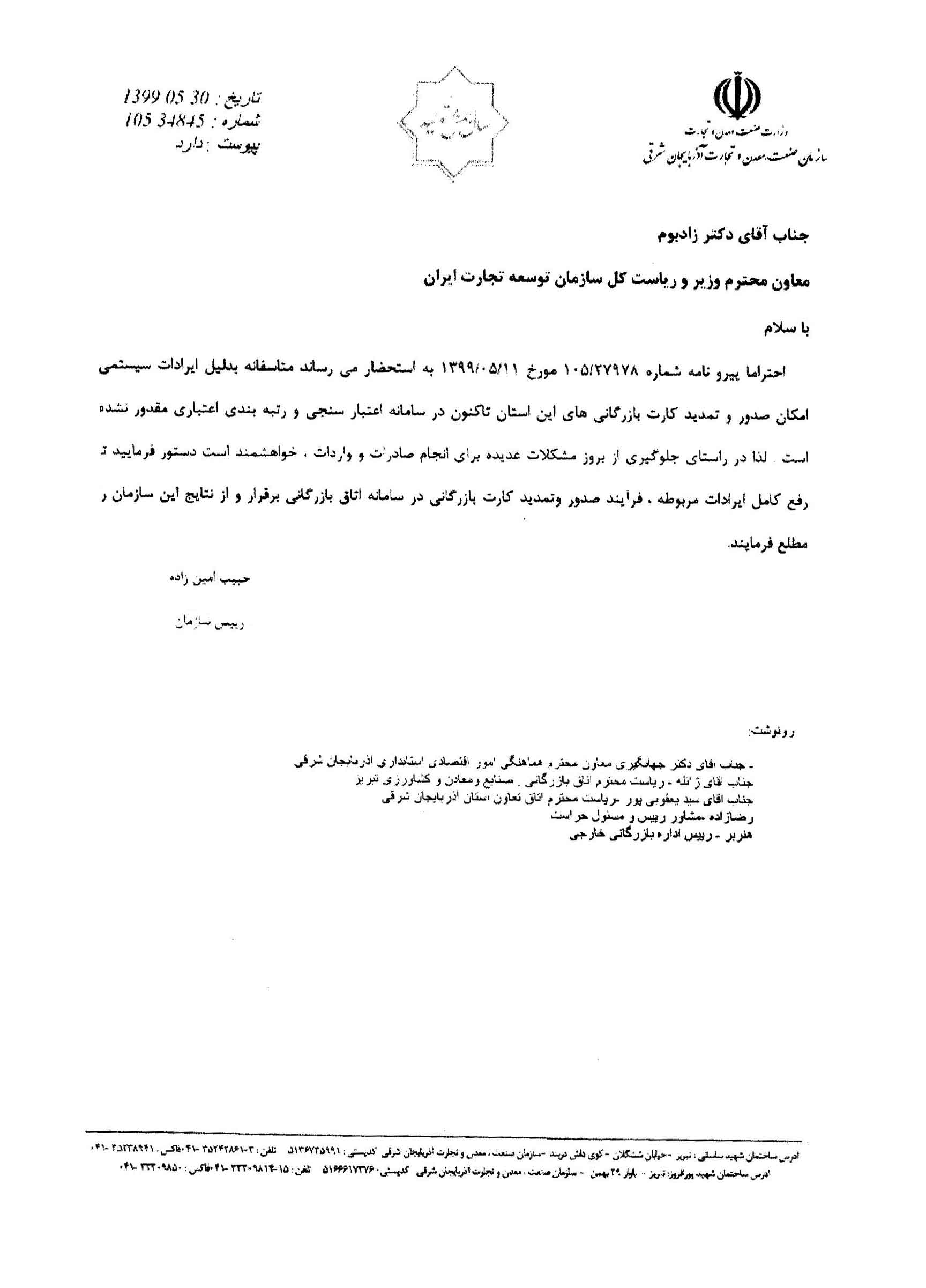 سازمان صمت استان طبق نامه به آقای زادبوم رئیس سازمان توسعه تجارت برگشت به فرآیند صدور و تمدید کارت بازرگانی در سامانه اتاق تا رفع کامل ایرادات مربوطه از سامانه جامع تجارت را پیشنهاد دادند.