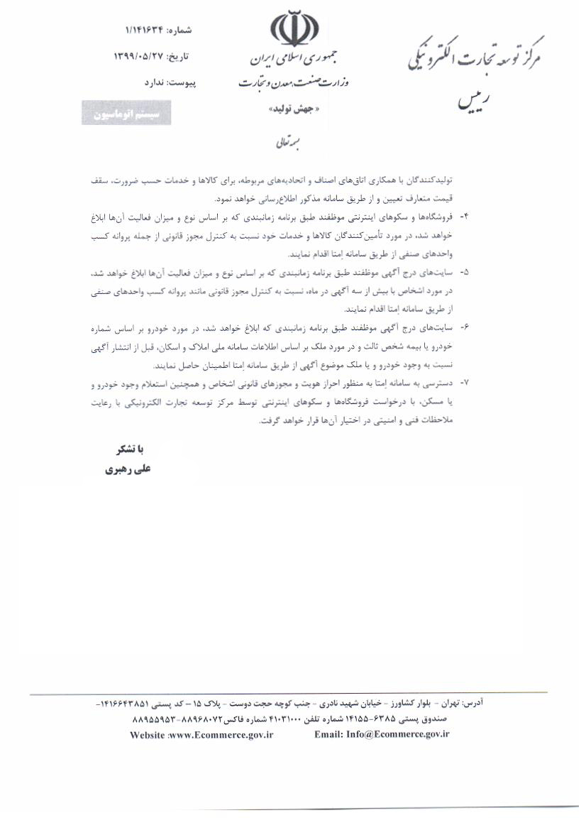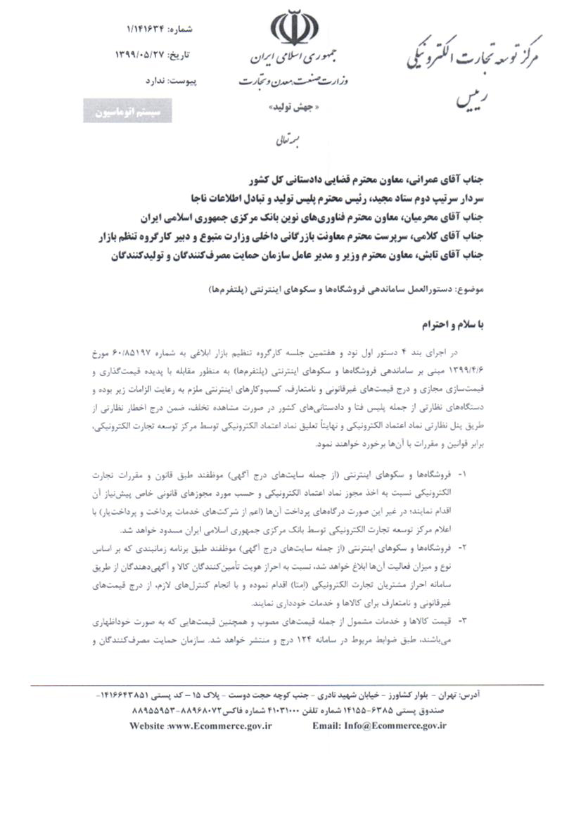 نامه وزارت صنعت و معدن مبنی بر دستورالعمل ساماندهی فروشگاهها و سکوهای اینترنتی (پلتفرم ها)