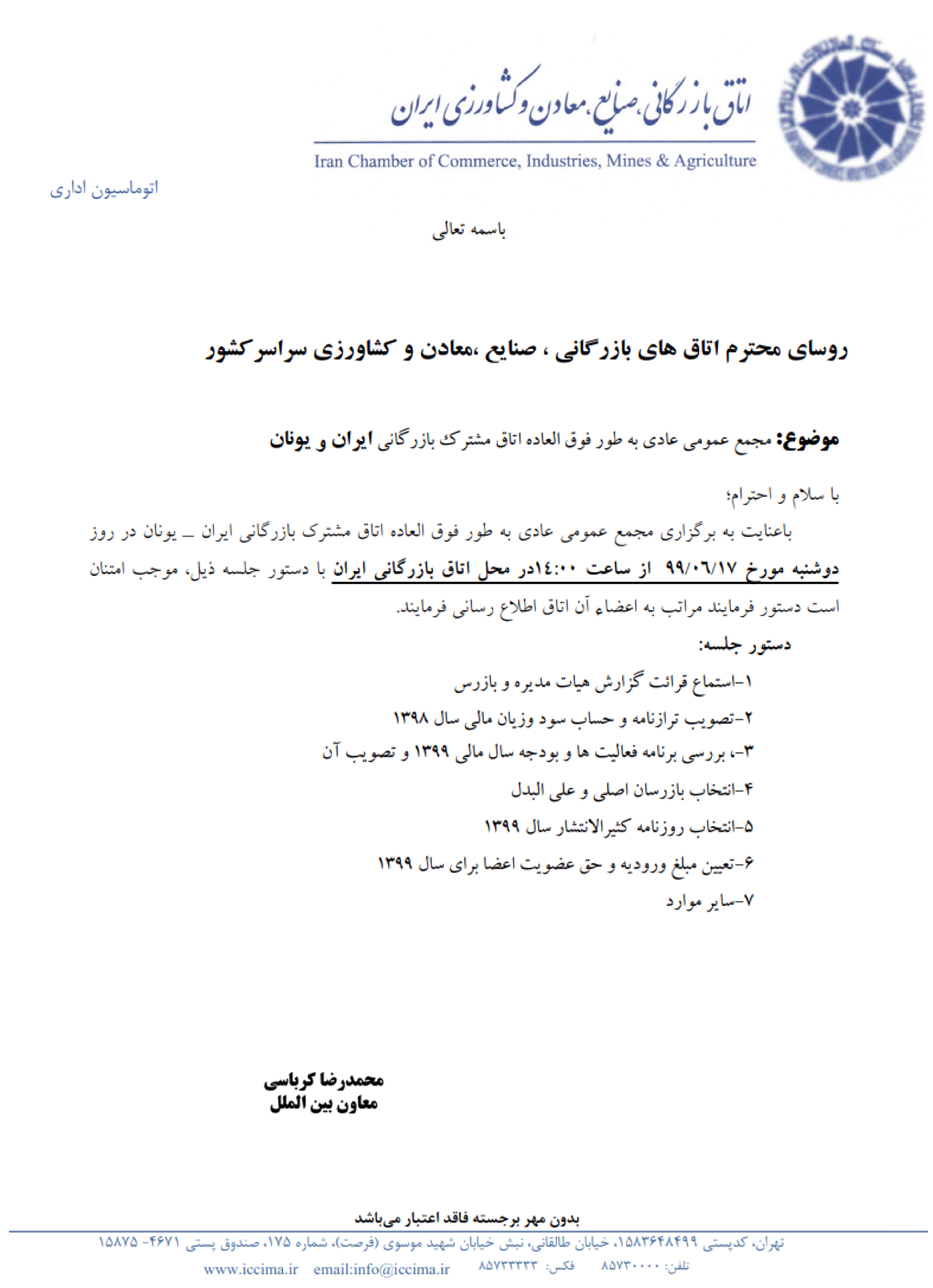 مجمع عمومی عادی به طور فوق العاده اتاق مشترک بازرگانی ایران و یونان