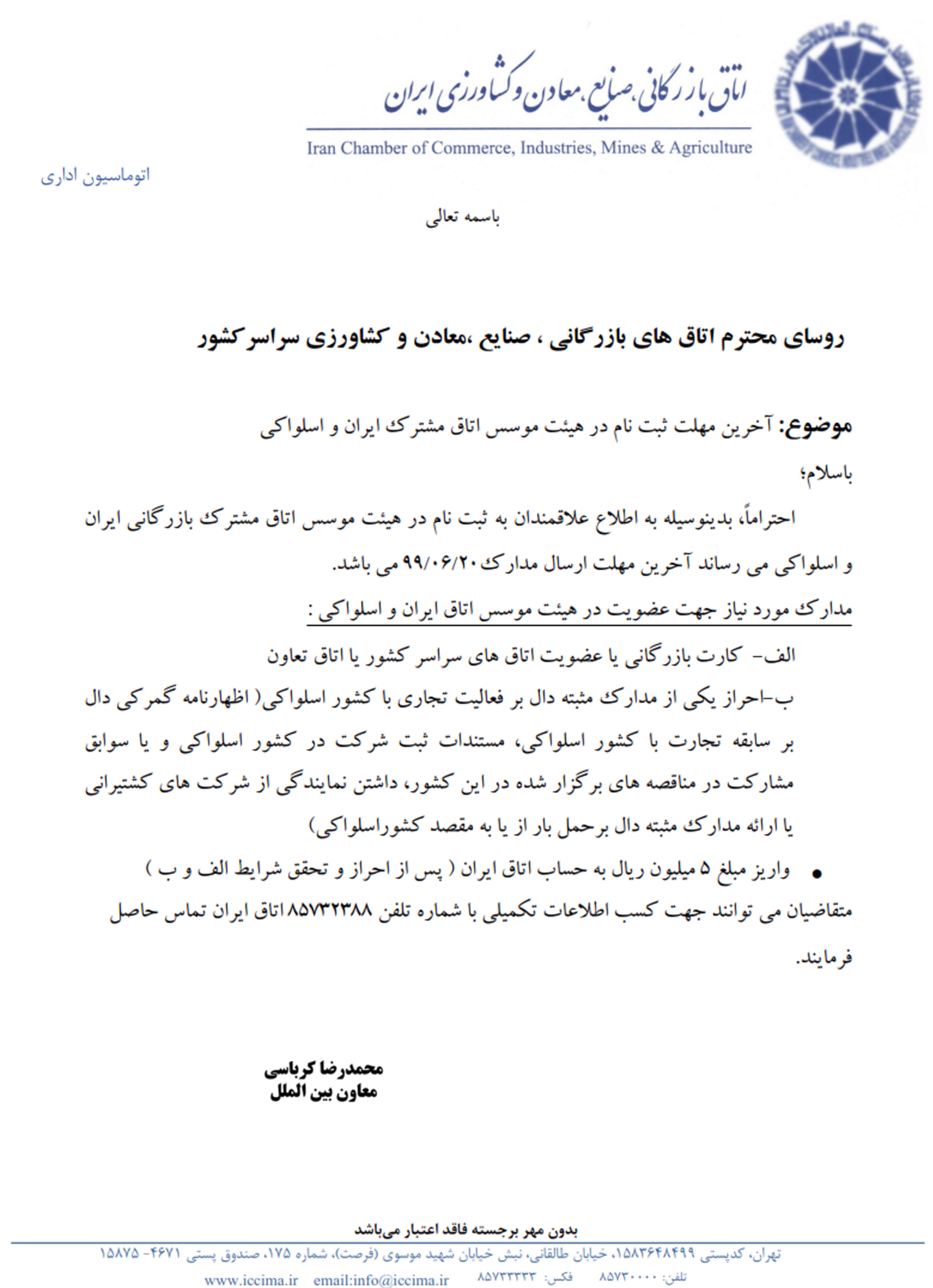 آخرین مهلت ثبت نام در هیئت موسس اتاق مشترک ایران و اسلواکی