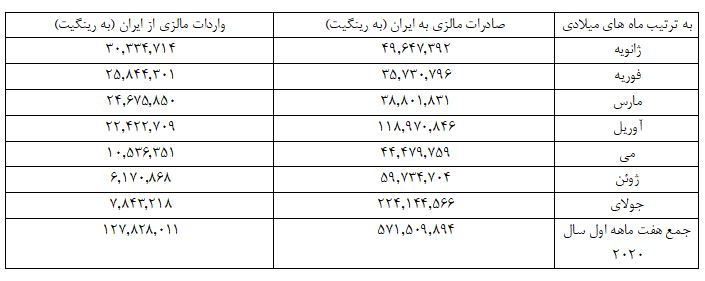 طبق آمار منتشر شده توسط دولت مالزی، آمار کلی تجارت بین مالزی و ایران در هفت ماهه اول سال 2020 به میزان 699.337.905 رینگیت رسیده است که از این میزان سهم صادرات مالزی به ایران حدود 571 میلیون رینگیت بوده و سهم ایران حدود 128 میلیون رینگیت میباشد. با مقایسه این آمار با مدت مشابه در سال 2019، شاهد کاهش 50 درصدی صادرات مالزی به ایران هستیم و در مقابل صادرات از ایران به این کشور نسبت به مدت مشابه سال قبل رشد نشان می دهد. در هفت ماهه اول سال 2019 صادرات مالزی به ایران بیش از یک میلیارد رینگیت ثبت شده و صادرات ایران به این کشور در حدود 85 میلیون رینگیت بود. به این ترتیب صادرات ثبت شده از ایران به مالزی حدود 43 میلیون رینگیت رشد نشان می دهد.