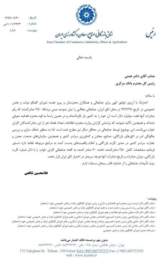 غلامحسین شافعی، رئیس اتاق ایران، در نامهای به عبدالناصر همتی، رئیسکل بانک مرکزی، در پی اظهاراتش مبنی بر وجود ۷۰ صادرکننده کارتنخواب که ارز خود را برنگرداندهاند، خواهان معرفی این افراد و مشخصات کارت بازرگانیشان به اتاقها برای بررسی و پیگیری صحت امر شد.