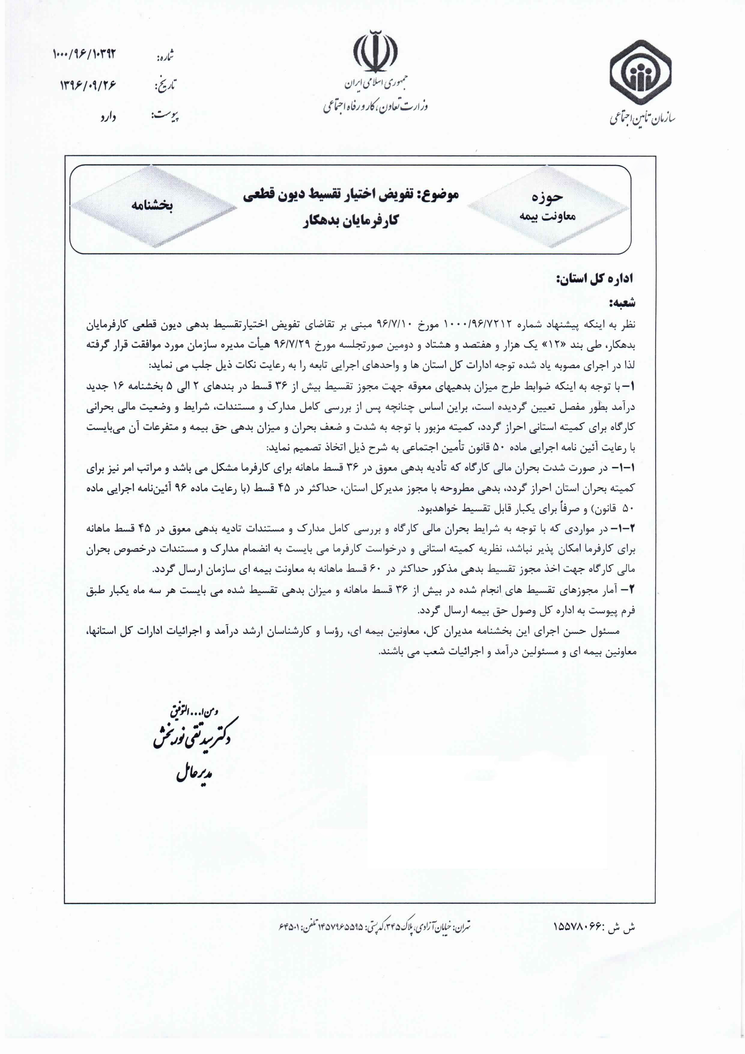 در بخشنامه‌ای که 26 آذرماه سال جاری ‌صادر شده است، آمده است: «نظر به اینکه پیشنهاد شماره 7212/96/1000 مورخ 10 مهر 96 مبنی بر تقاضای تفویض اختیار تقسیط بدهی دیون قطعی کارفرمایان بدهکار، طی بند 12 یکهزار و هفتصد و هشتاد و دومین صورت جلسه مورخ 29 مهر 96 هیات مدیره سازمان، مورد موافقت قرار گرفته بنابراین در اجرای مصوبه یاد شده توجه ادارات کل استان‌ها و واحدهای اجرایی‌ تابعه را به رعایت نکات زیر جلب می‌نماید: