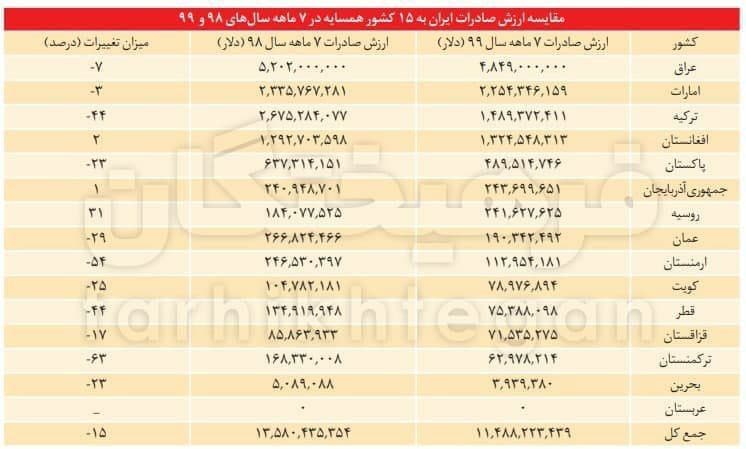 جدول مقایسهای میزان صادرات به کشورهای همسایه در هفت ماهه اول سالهای 98 و 99