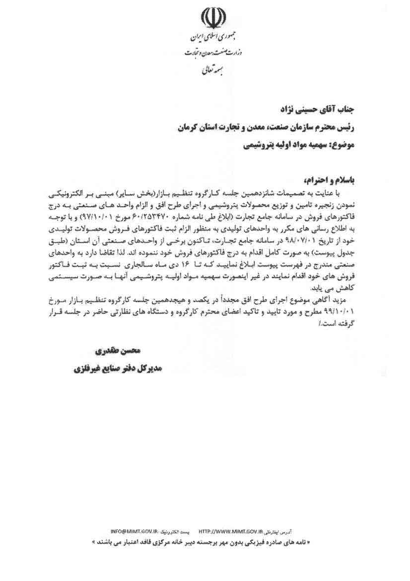 نامه وزارت صمت درخصوص سهمیه مواد اولیه پتروشیمی