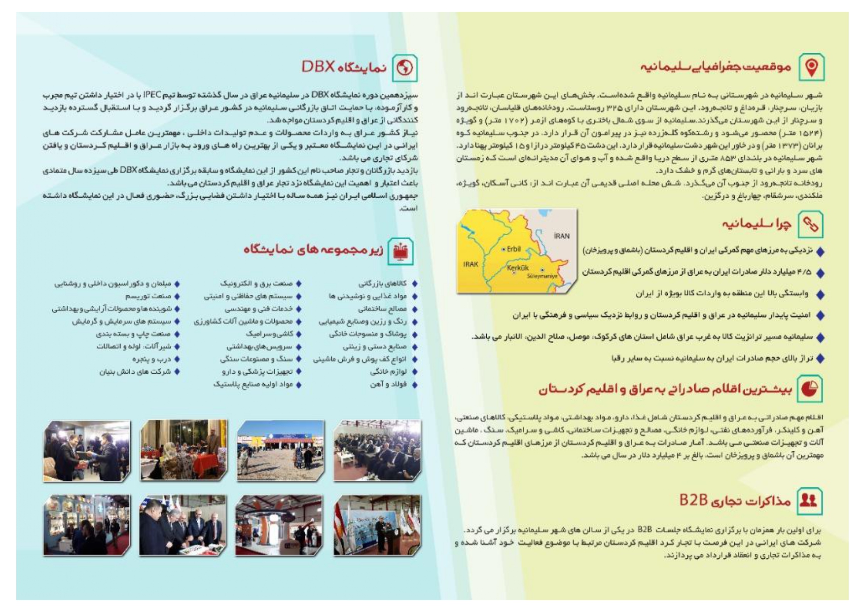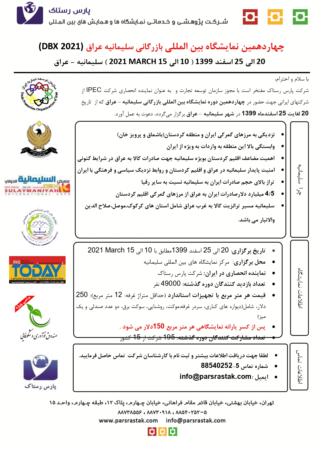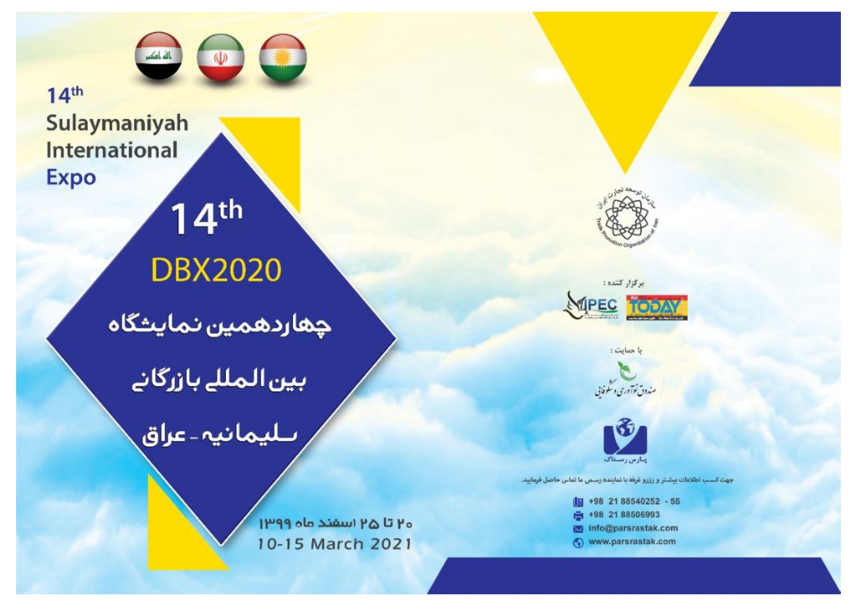 حسب اطلاع واصله از نمایندگی وزارت امور خارجه، چهاردهمین نمایشگاه بینالمللی بازرگانی سلیمانیه از 20 لغایت 25 اسفند ماه سال جاری در محل نمایشگاههای بینالمللی سلیمانیه برگزار خواهد شد. علاقهمندان میتوانند جهت کسب اطلاعات بیشتر با شمارههای 5-88540252-021 تماس حاصل نمایند.