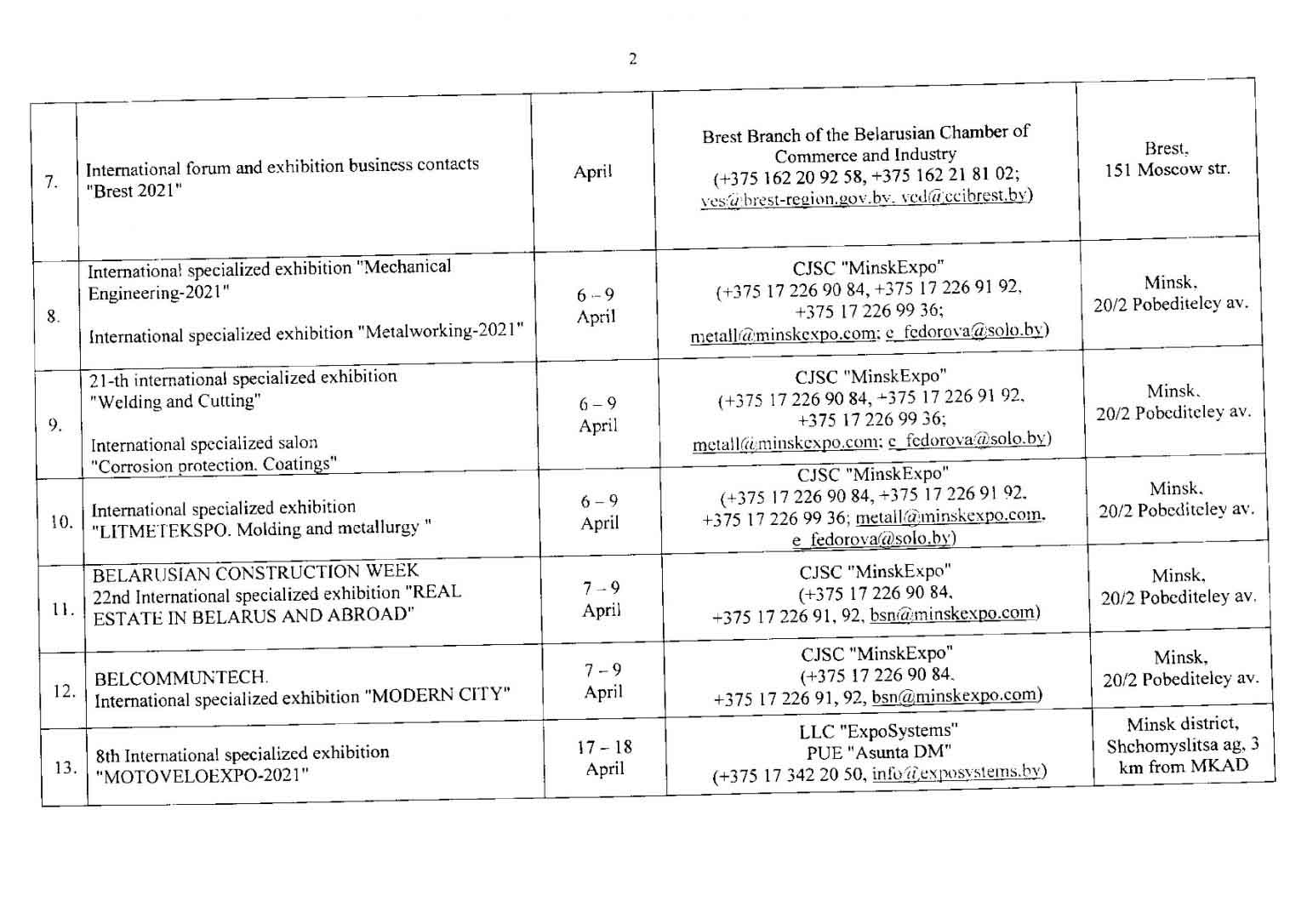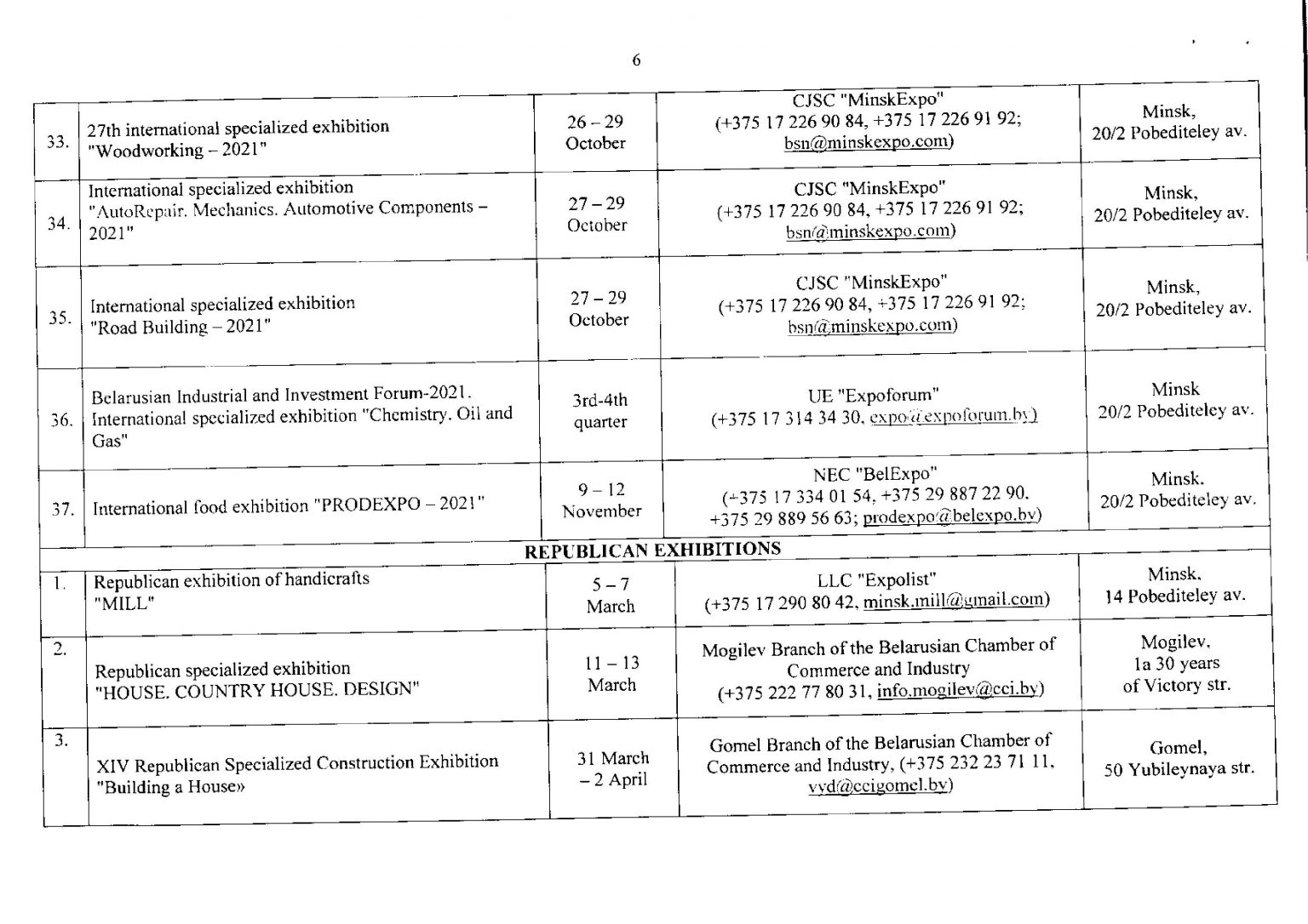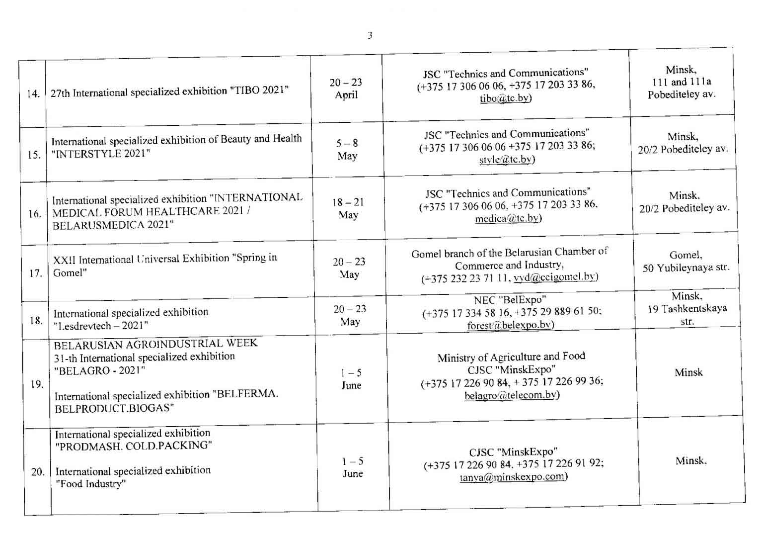 تقویم نمایشگاهی بلاروس در سال 2021
