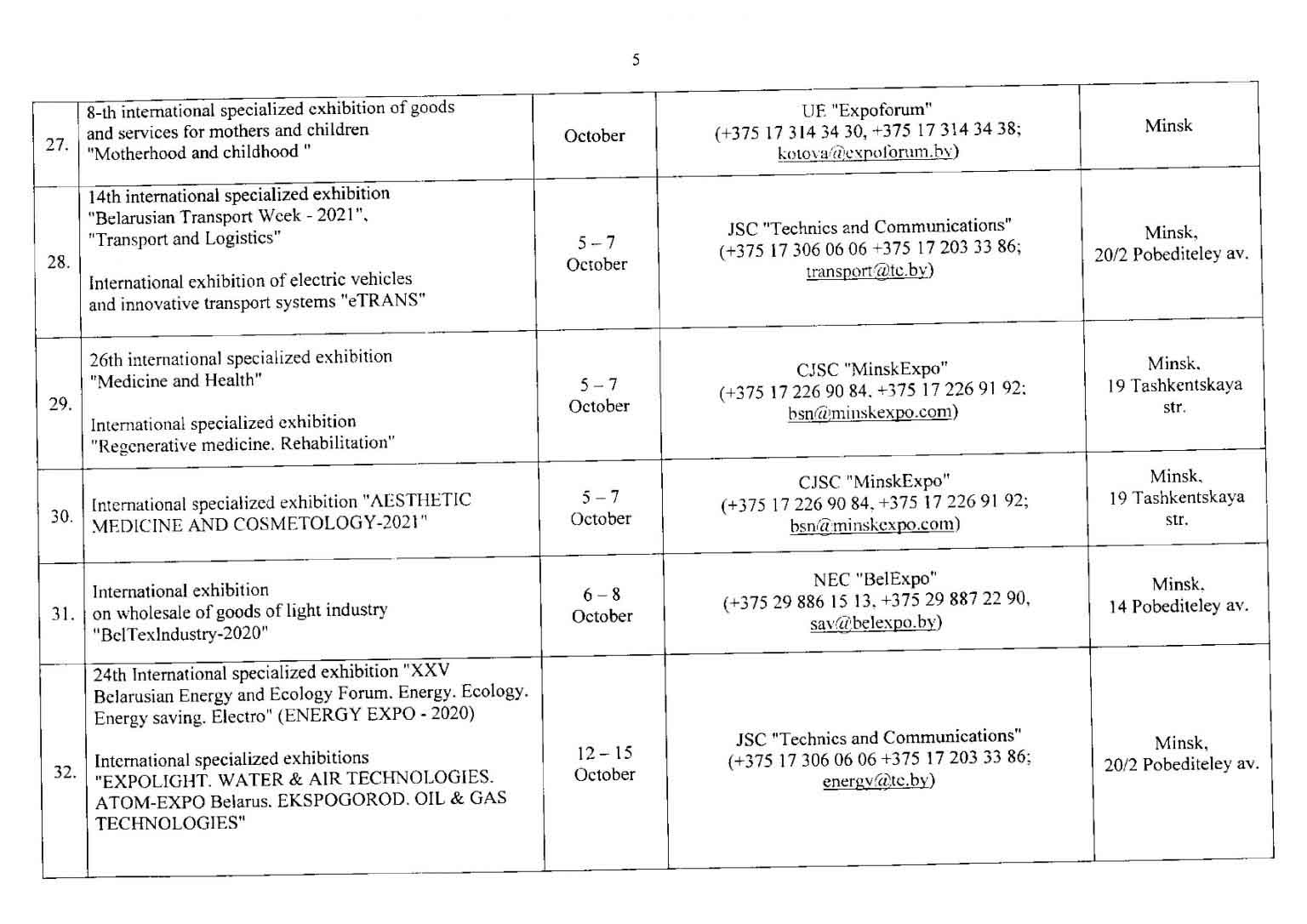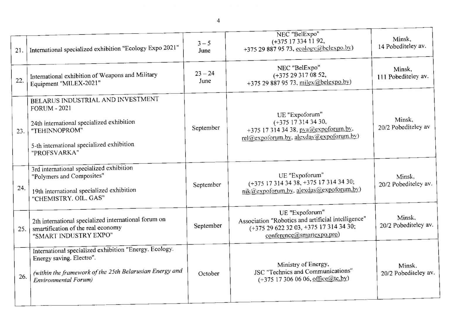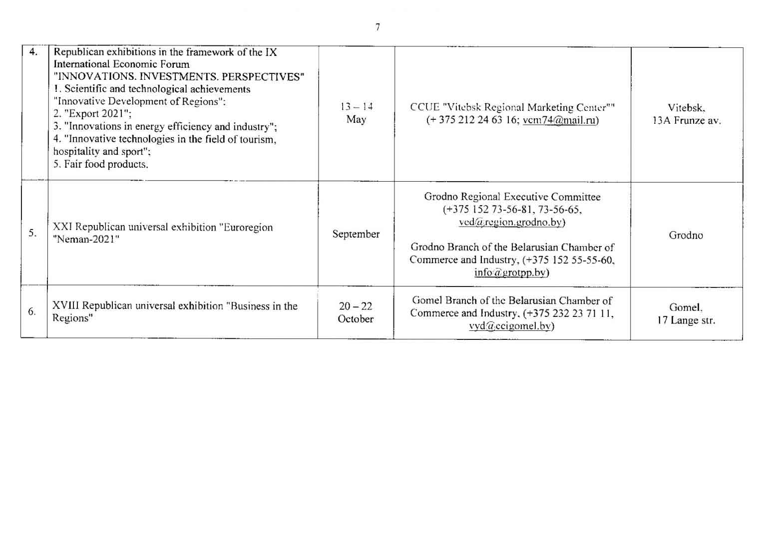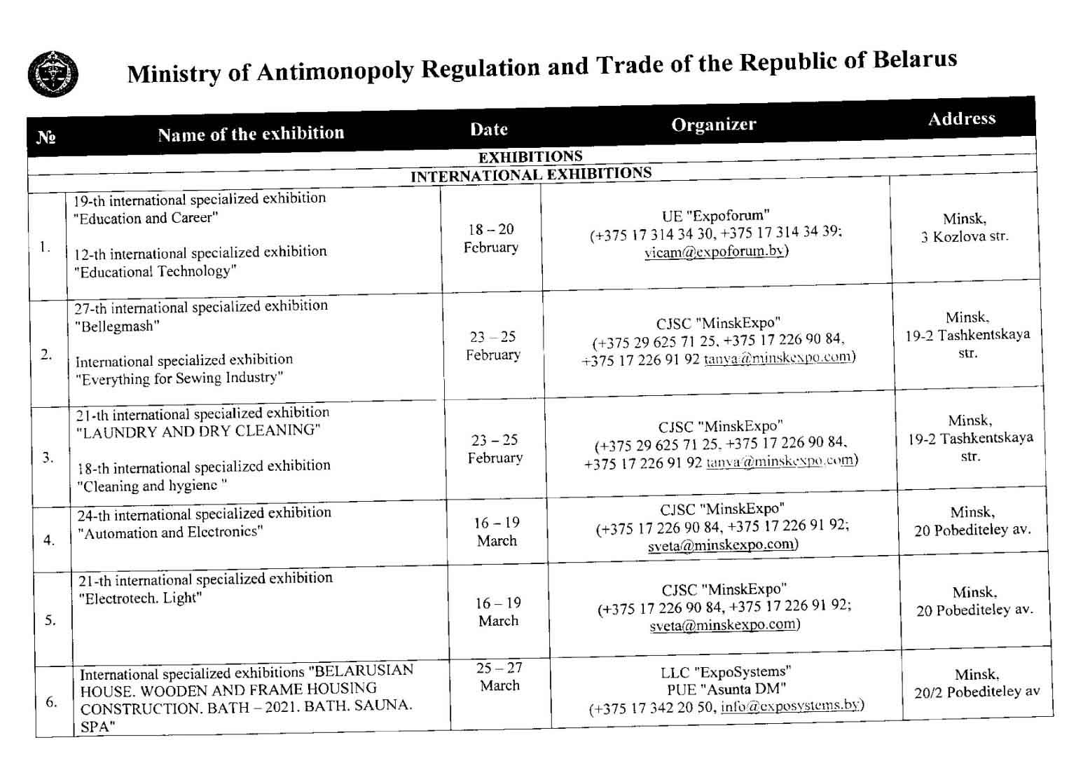 تقویم نمایشگاهی بلاروس در سال 2021