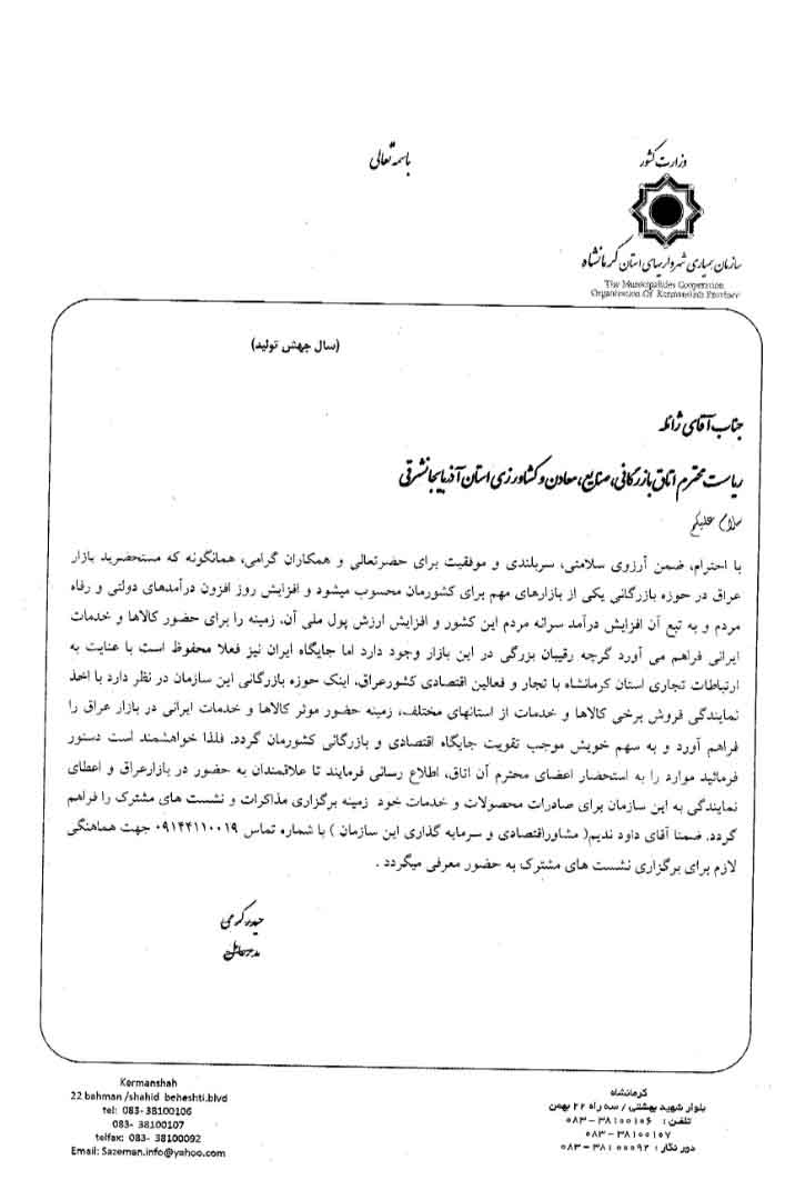 اخذ نمایندگی فروش برخی کالاها و خدمات از استان های مختلف به کشور عراق توسط سازمان همیاری شهرداری های کرمانشاه
