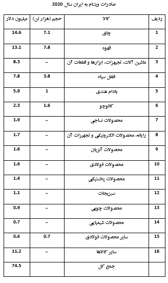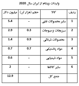 بر اساس داده‌های اداره کل گمرک ویتنام روابط تجاری ایران با ویتنام در سال 2020 شامل واردات و صادرات میان این دو کشور به تفکیک کالاها، با بیشترین ارزش به شرح جداول زیر است: