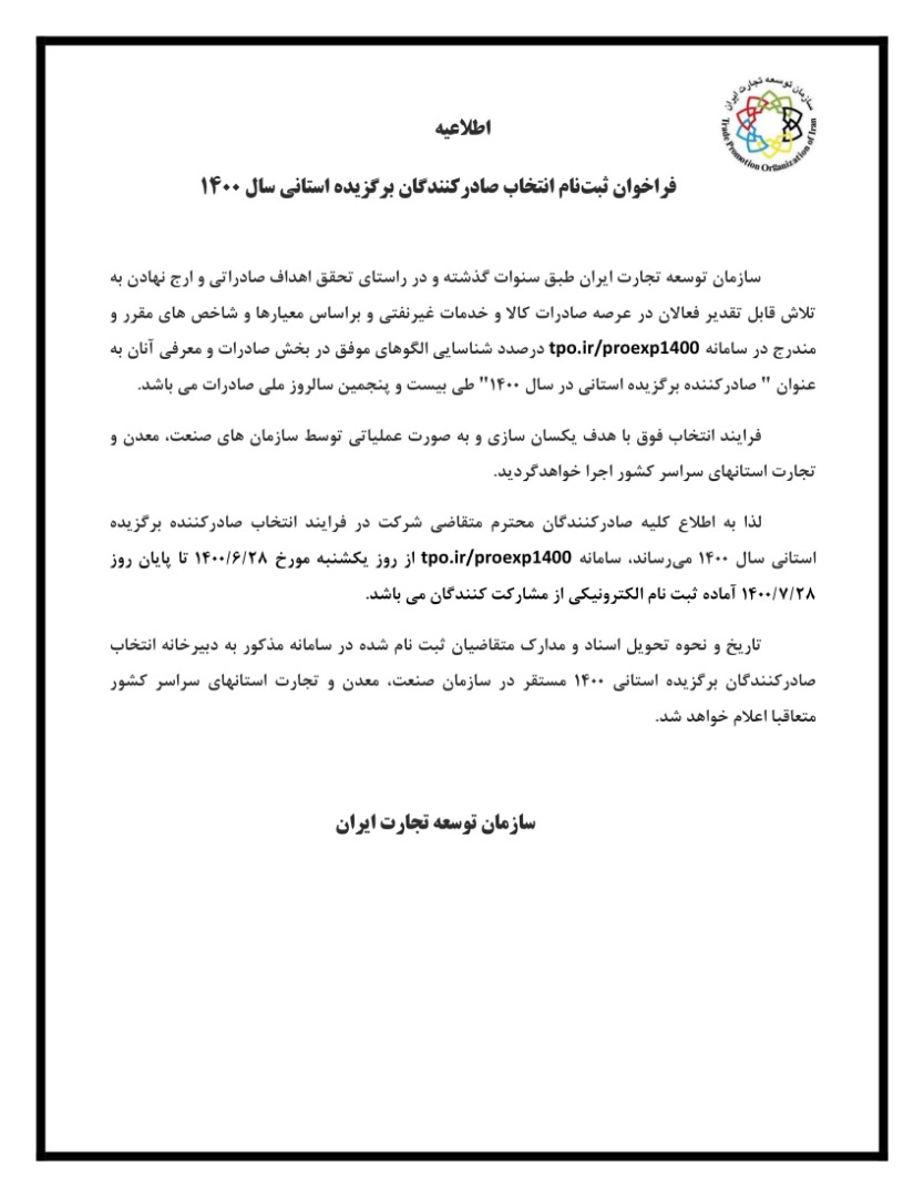 فراخوان ثبت نام انتخاب صادرکنندگان برگزیده استانی سال 1400
