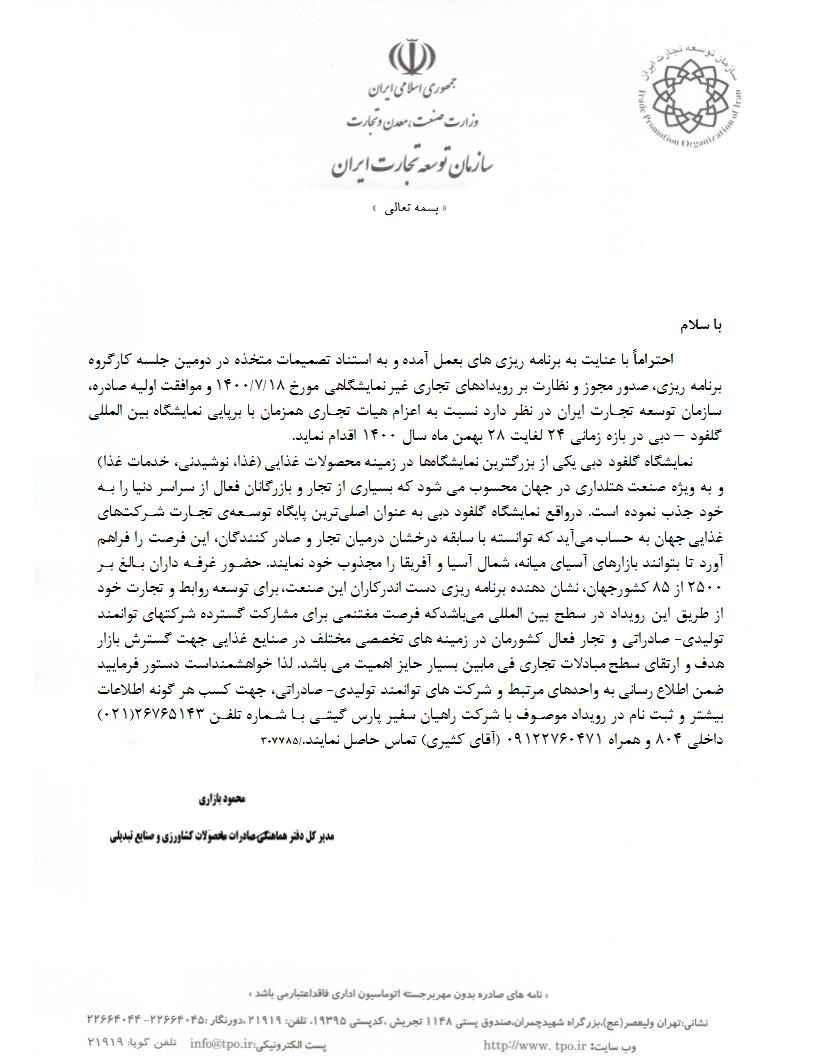 اعزام هیات تجاری همزمان با برپایی نمایشگاه گلفود-دبی در بهمن ماه 1400