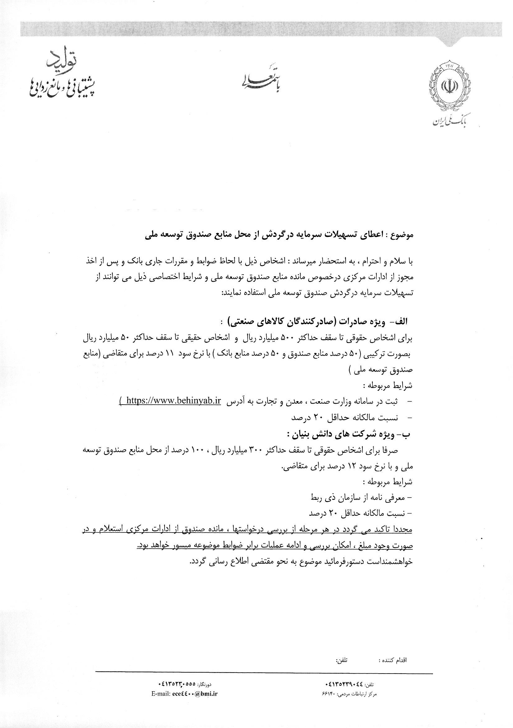 اعطای تسهیلات سرمایه در گردش از محل منابع صندوق توسعه ملی