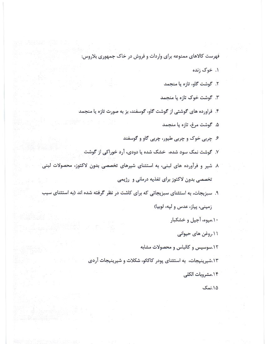 فهرست کالاهای ممنوعه جهت بهرهگیری اعضای فعال در زمینه صادرات به بلاروس: