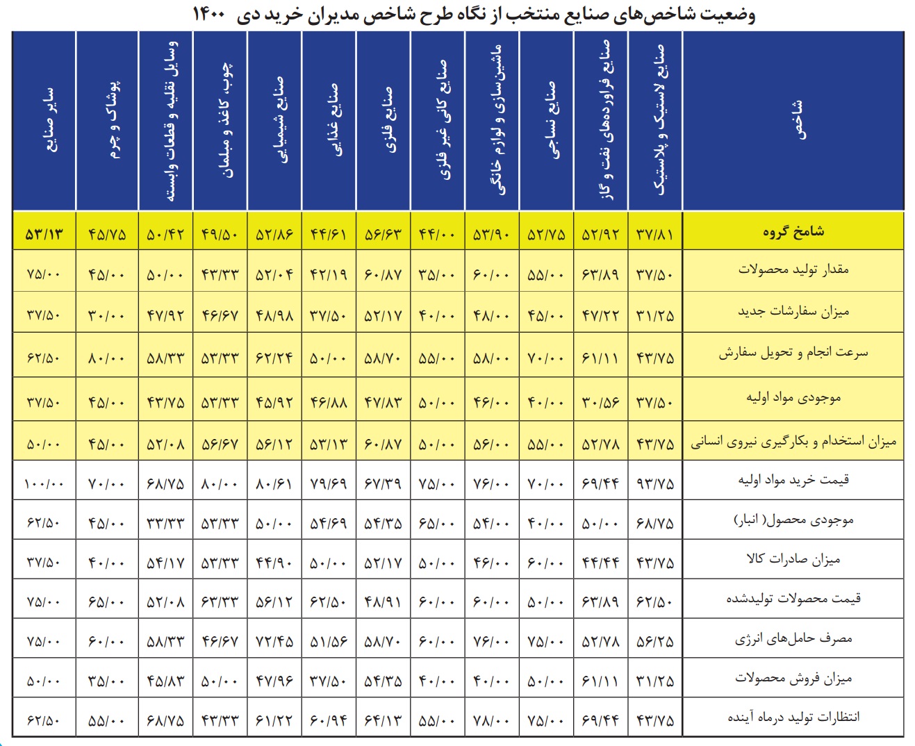 بر اساس داده‌های به دست آمده از بنگاه‌های بخش صنعت، شاخص مدیران خرید صنعت در دی‌ماه عدد ۵۰,۳۱ به دست آمده است. به اعتقاد اکثر فعالان بخش صنعت، نرخ رشد فعالیت‌ها به کمترین مقدار ۵ ماهه اخیر رسیده است. در دی‌ماه در میان مؤلفه‌های اصلی شاخص میزان سفارشات جدید مشتریان و موجودی مواد اولیه عدد زیر ۵۰ را به ثبت رسانده‌اند. همچنین در صنایع کانی غیرفلزی، غذایی، پوشاک و چرم، لاستیک و پلاستیک و چوب، کاغذ و مبلمان عدد شاخص کل، زیر ۵۰ بوده است.