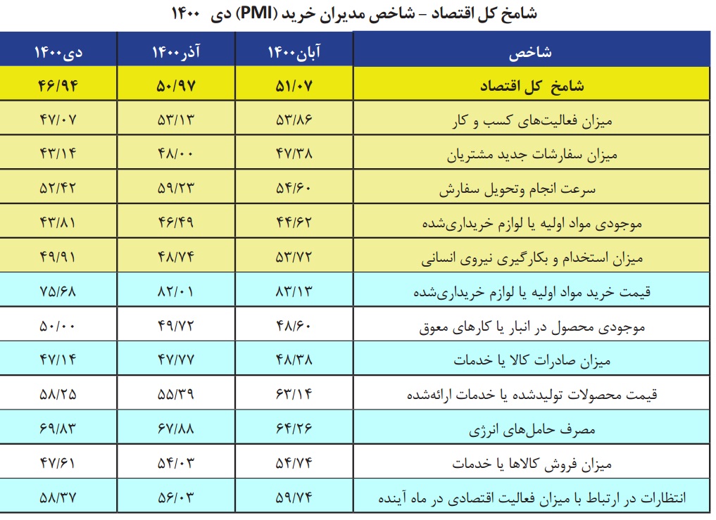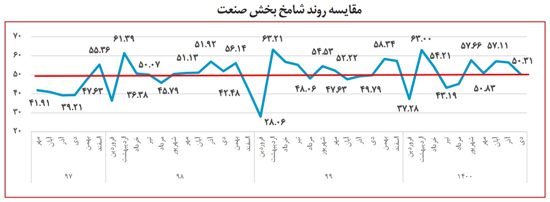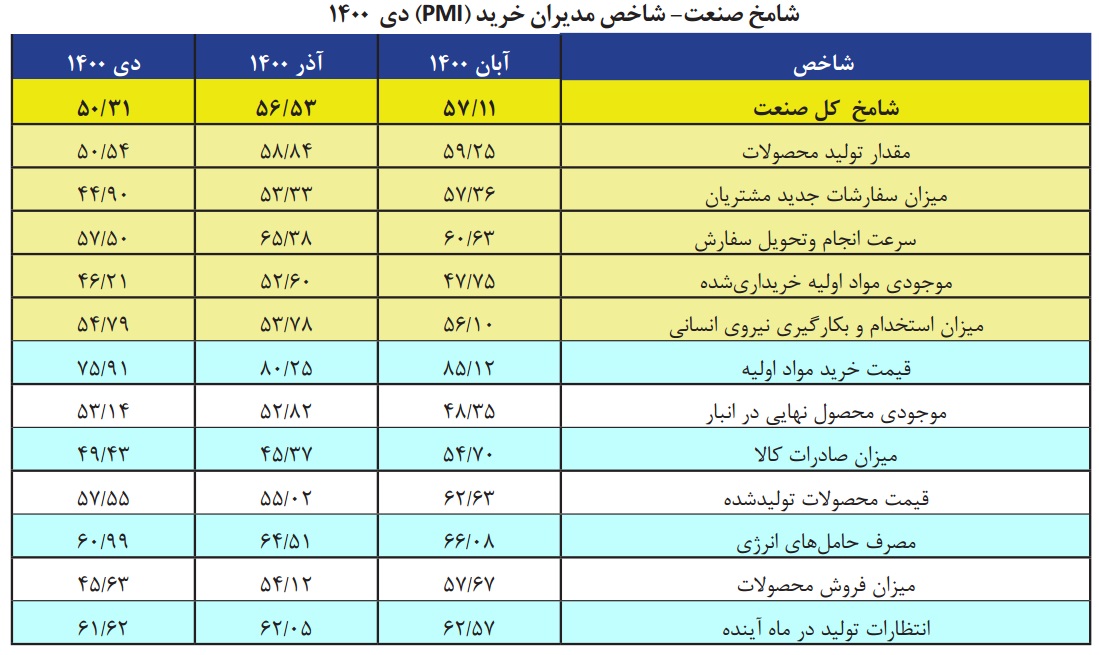 همچنین این مرکز در گزارش چهلمین دوره طرح شاخص مدیران خرید (PMI) بخش صنعت، شامخ این بخش در دی ۱۴۰۰ را ۵۰,۳۱ واحد محاسبه کرده که کمترین مقدار در ۵ ماه اخیر محسوب می‌شود. در این ماه از میان همه مؤلفه‌های اصلی شامخ بخش صنعت، دو شاخص میزان سفارشات جدید مشتریان و موجودی مواد اولیه، عدد زیر ۵۰ را به ثبت رسانده‌اند و مابقی مؤلفه‌ها باوجود رسیدن به کمترین مقدار در ۵ ماه اخیر، همچنان بالای ۵۰ واحد باقی مانده‌اند.