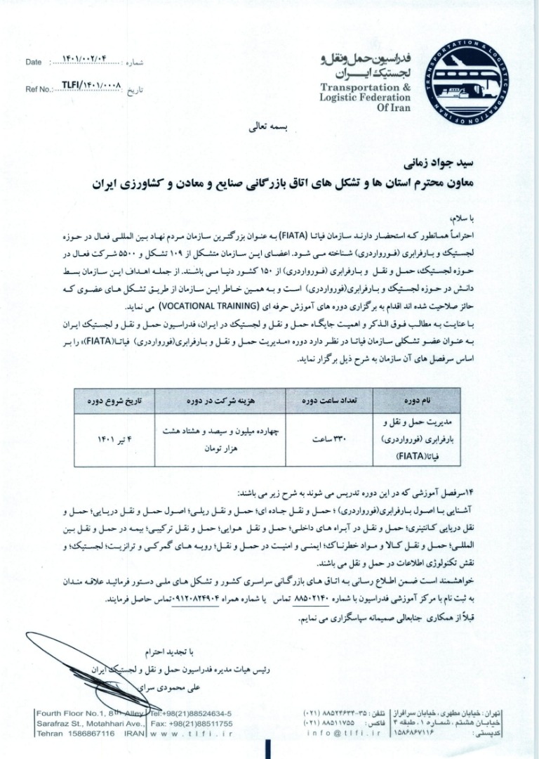 برگزاری دوره آموزشی مدیریت حمل و نقل و بارفرابری فیاتا