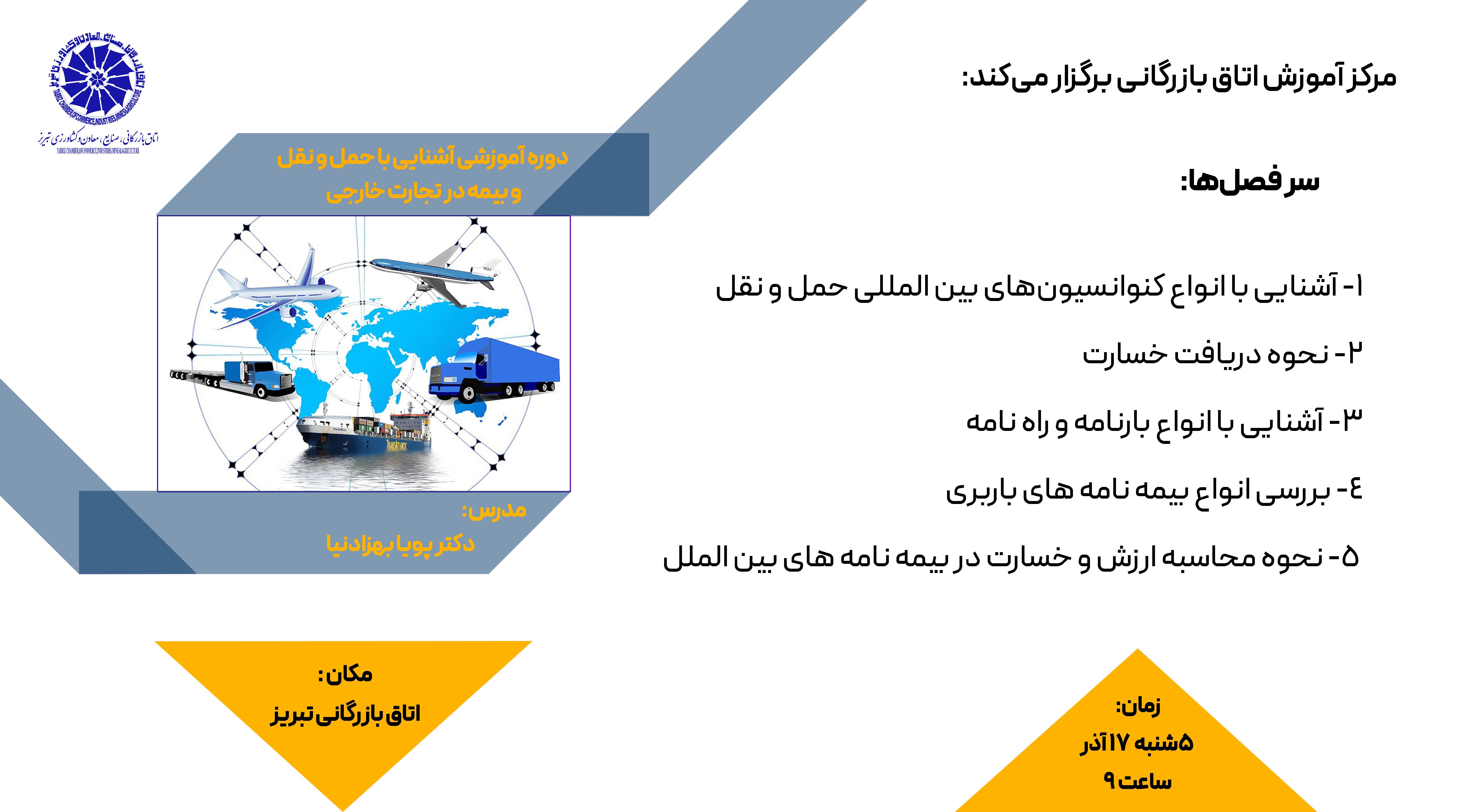 دوره آموزشی «آشنایی با حمل و نقل و بیمه در تجارت خارجی» به همت مرکز آموزش اتاق بازرگانی تبریز برگزار می شود.