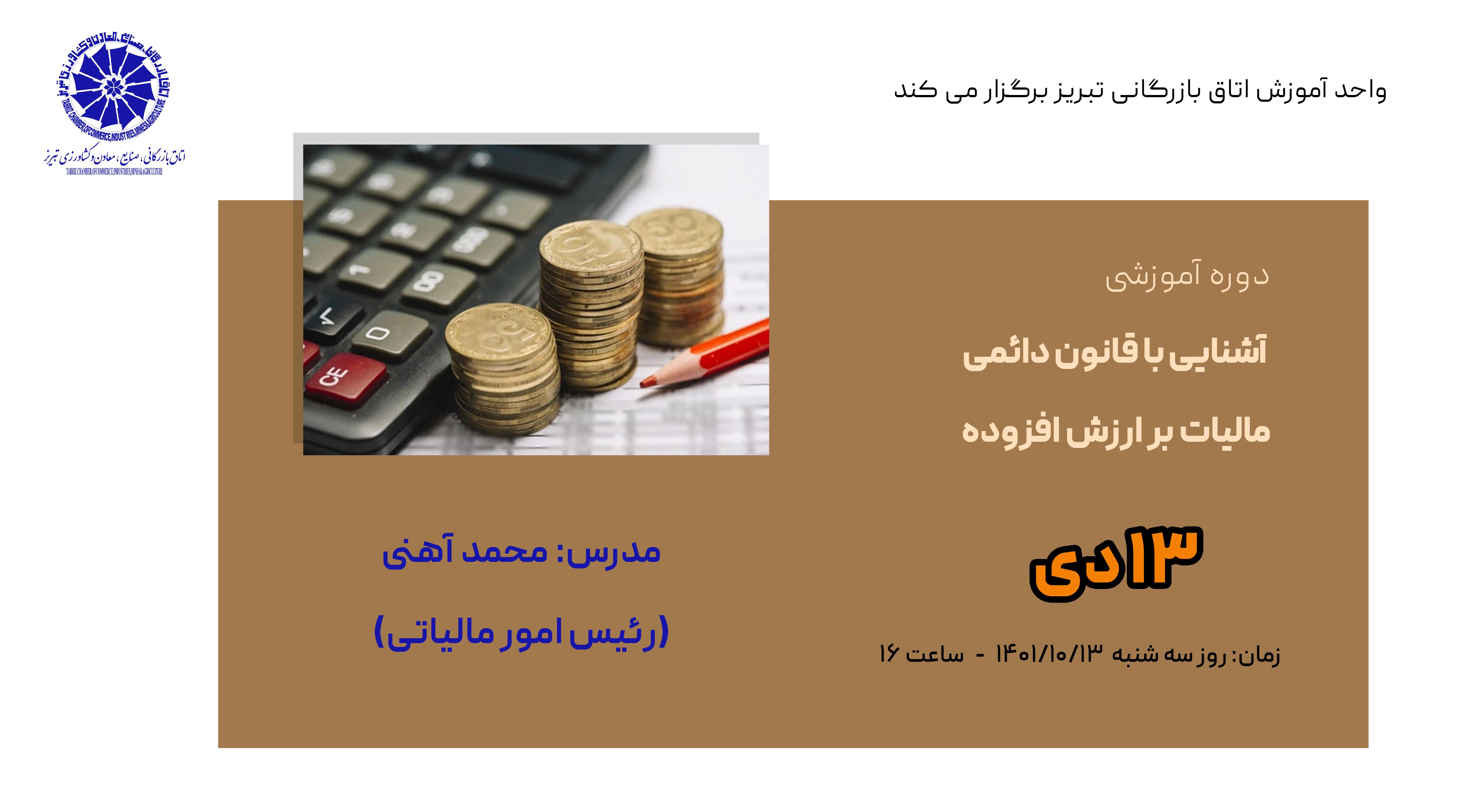 دوره آموزشی « آشنایی با قانون دائمی مالیات بر ارزش افزوده» با تدریس محمد آهنی، رییس امور مالیاتی توسط اتاق بازرگانی تبریز برگزار می شود.