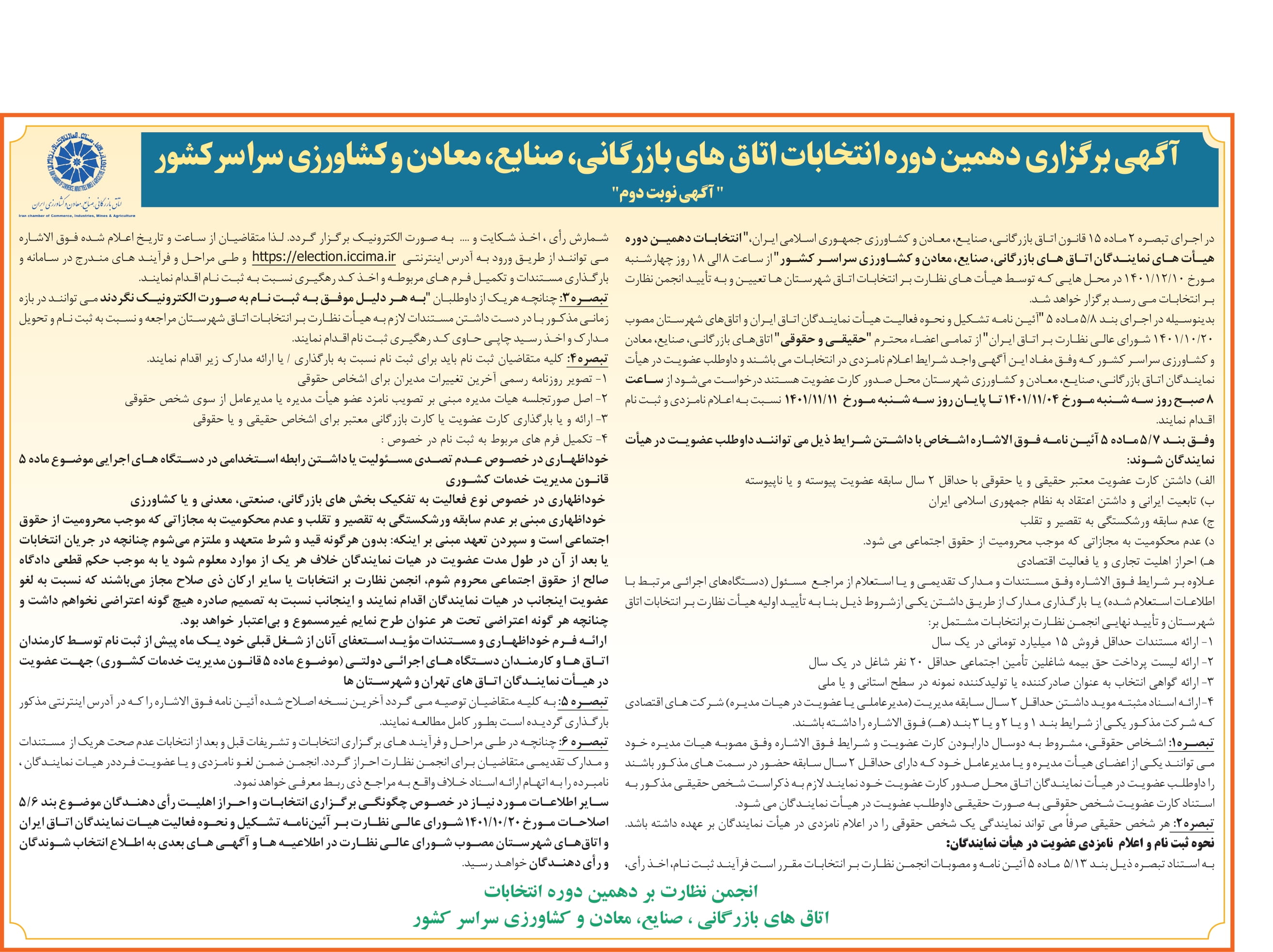 آگهی برگزاری دهمین دوره انتخابات اتاق های بازرگانی صنایع معادن و کشاورزی سراسر کشور (آگهی نوبت دوم)