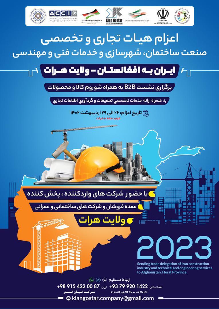 هیات تجاری و تخصصي صنعت ساختمان، شهرسازي و خدمات فني و مهندسي، با هدف توسعه صادرات و فروش مستقیم كالا و خدمات ساختماني از تاریخ 26 لغایت 29 اردیبهشت ماه سالجاری به افغانستان (ولایت هرات) اعزام میشود.