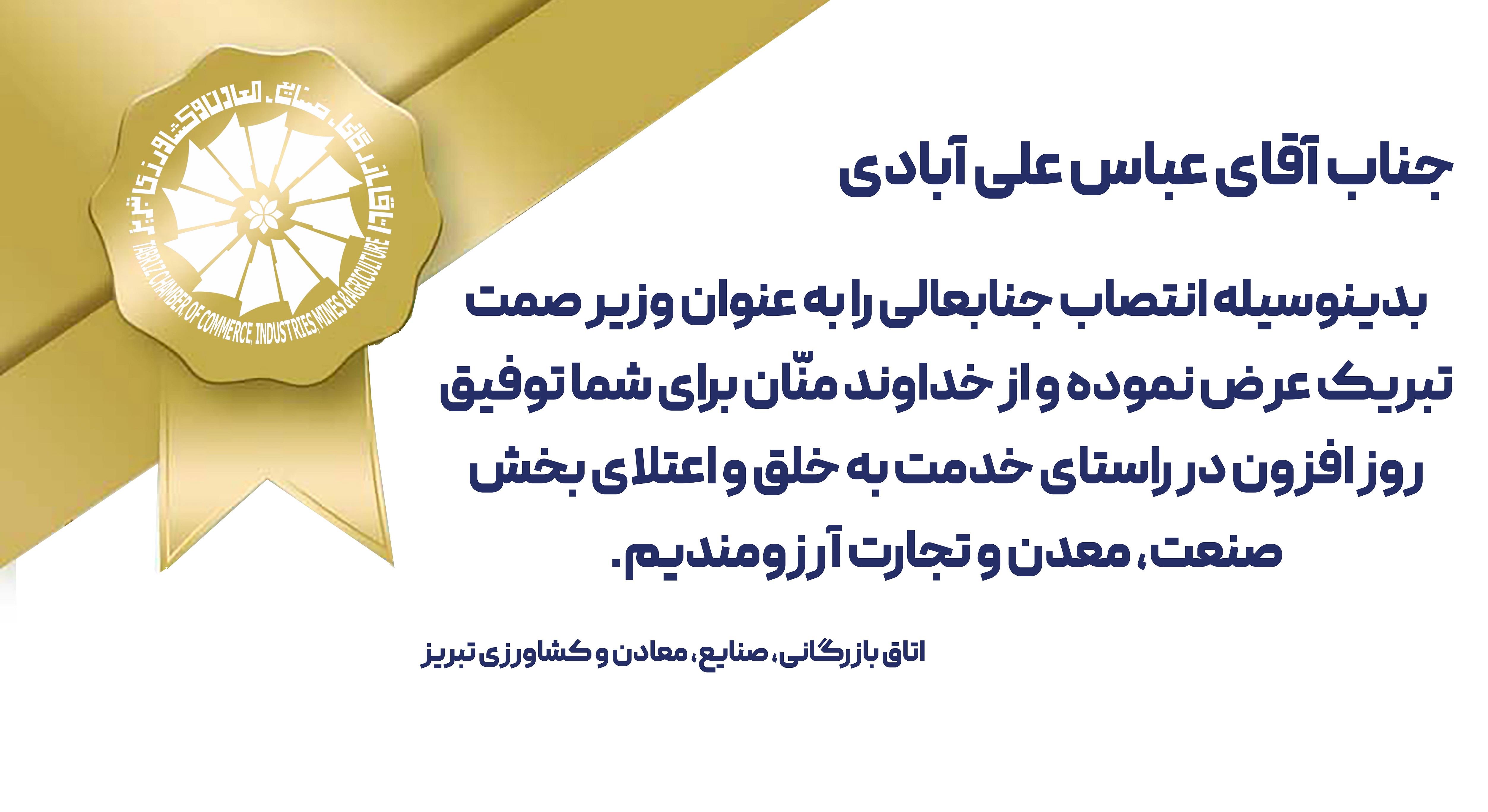 اتاق بازرگانی تبریز انتصاب عباس علی آبادی؛ وزیر جدید سازمان صنعت، معدن و تجارت را تبریک گفت.