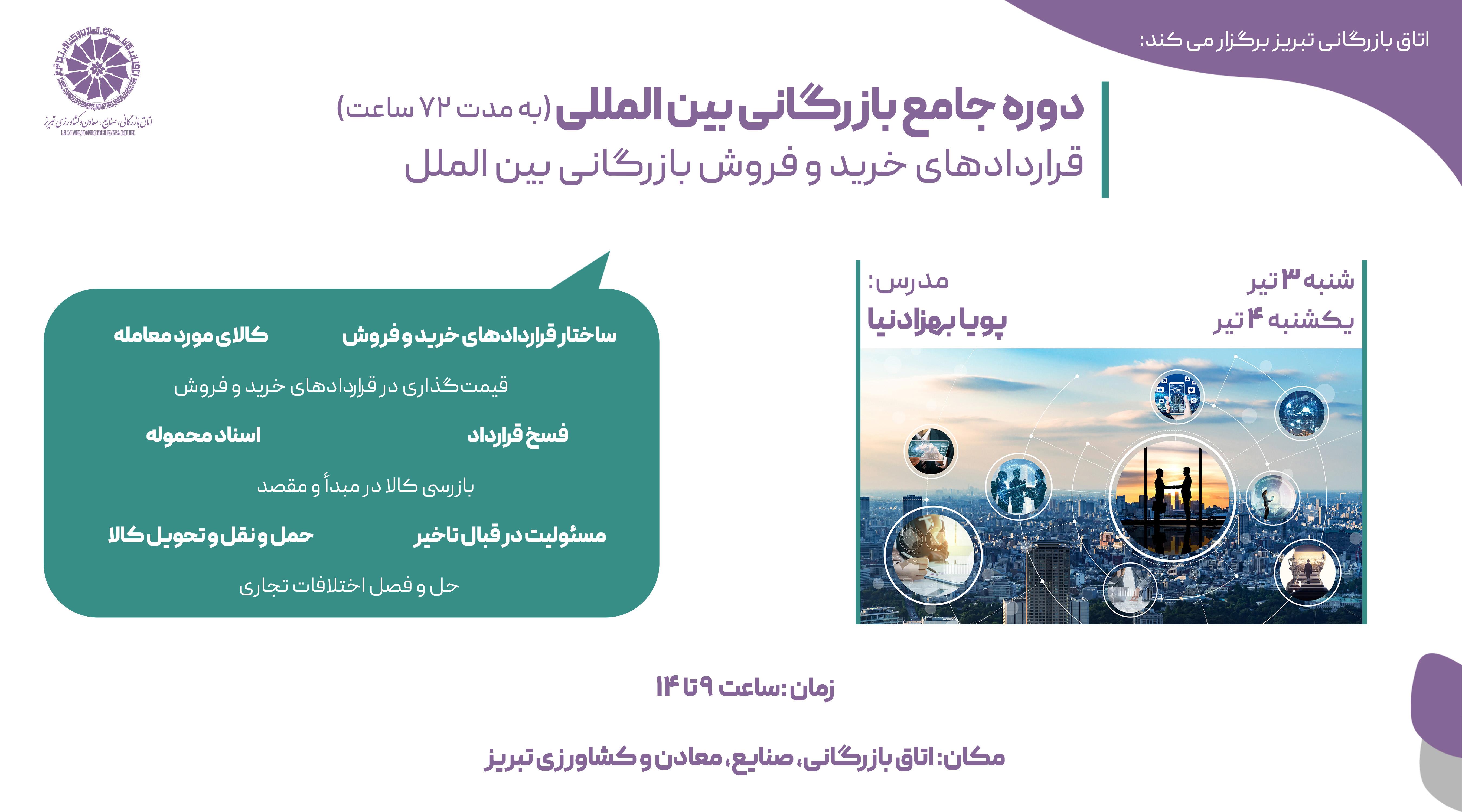 به گزارش روابط عمومی اتاق بازرگانی تبریز، در قالب این دوره جامع مواردی با سرفصل‌های « قراردادهای خرید و فروش بازرگانی بین الملل» و «اصول طبقه‌بندی و تعیین تعرفه کالا در گمرک» با تدریس پویا بهزادنیا به علاقه‌مندان آموزش داده می‌شود.