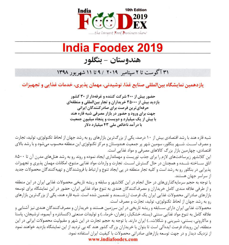 یازدهمین نمایشگاه بین المللی صنایع غذا، نوشیدنی، مهمان پذیری، خدمات غذایی و تجهیزات در بنگلور هندوستان برگزار می شود.