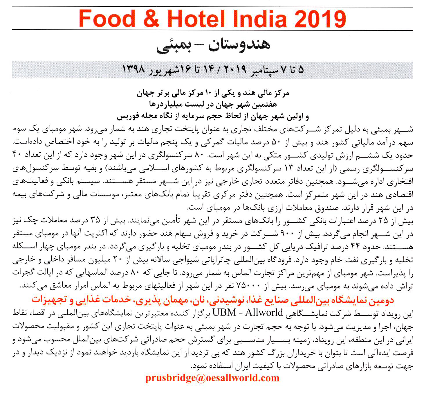 دومین نمایشگاه بین المللی صنایع غذا، نوشیدنی، نان، مهمان پذیری، خدمات غذایی و تجهیزات در بمبئی هندوستان برگزار خواهد شد.