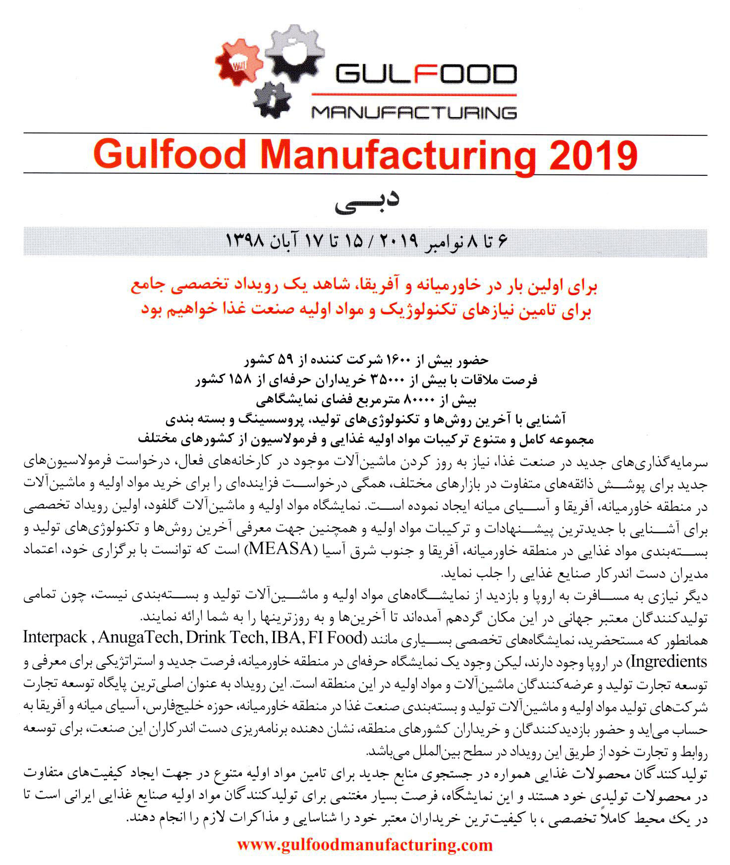 برای اولین بار در خاورمیانه و آفریقا، شاهد یک رویداد تخصصی جامع برای تامین نیازهای تکنولوژیک و مواد اولیه صنعت غذا خواهیم بود.