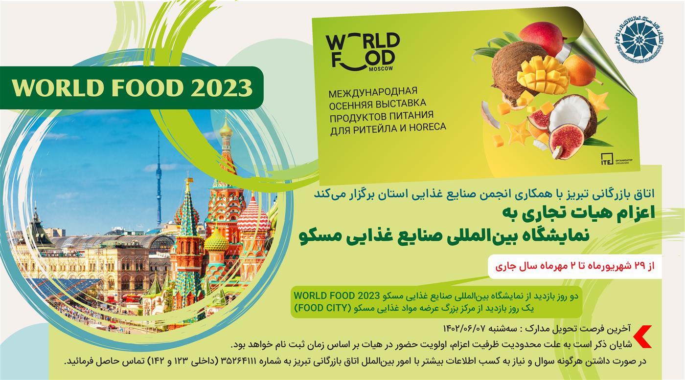 به اطلاع اعضای محترم اتاق بازرگانی، صنایع، معادن و کشاورزی تبریز میرساند، این اتاق با همکاری انجمن صنایع غذایی استان در نظر دارد هیاتی متشکل از بازرگانان و صاحبان صنایع را از تاریخ 29 شهریور لغایت 2 مهر ماه سال جاری جهت بازدید از نمایشگاه بین المللی صنایع غذایی WORLD FOOD 2023 مسکو به کشور فدراسیون روسیه اعزام نماید.