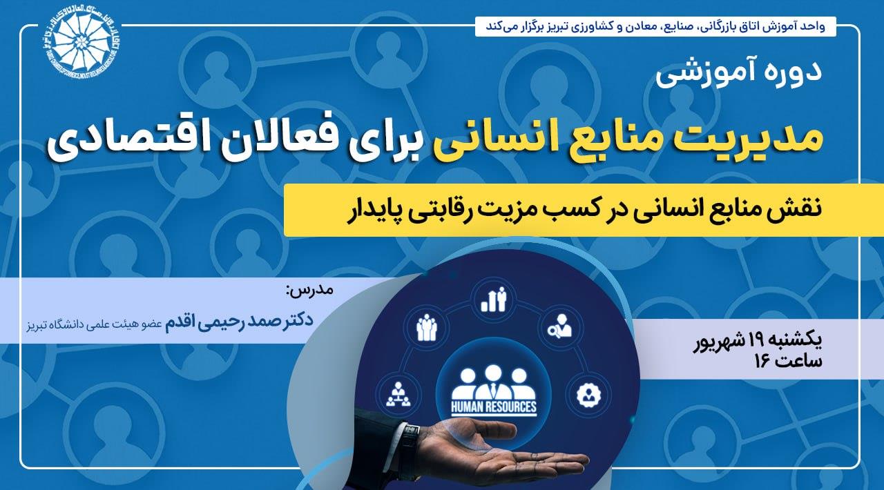 دوره آموزشی مدیریت منابع انسانی برای فعالان اقتصادی با (محوریت نقش منابع انسانی در کسب مزیت رقابتی پایدار) برگزار می شود.