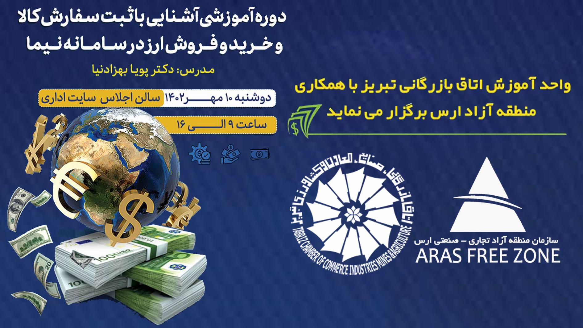 دوره آموزشی «آشنایی با ثبت سفارش کالا و خرید و فروش ارز در سامانه نیما» با مشارکت اتاق بازرگانی تبریز و منطقه آزاد ارس برگزار می‌شود.