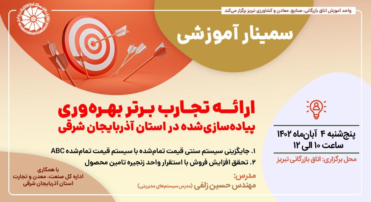 سمینار آموزشی ارائه تجارب برتر بهرهوری پیادهسازی شده در استان آذربايجانشرقی با همکاری مشترک اتاق بازرگانی تبریز و اداره کل صمت آذربایجانشرقی برگزار میشود.