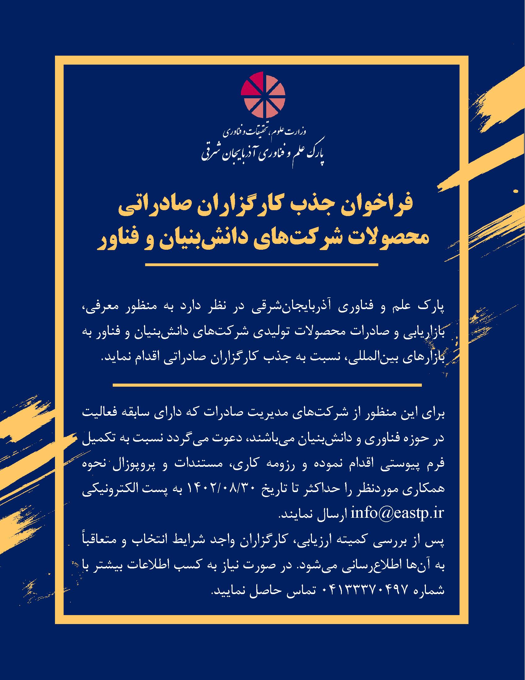 پارک علم و فناوری آذربایجانشرقی در نظر دارد بهمنظور معرفی بازاریابی و صادرات محصولات تولیدی شرکتهای دانشبنیان و فناور به بازارهای بینالمللی نسبت به جذب کارگزاران صادراتی اقدام کند.