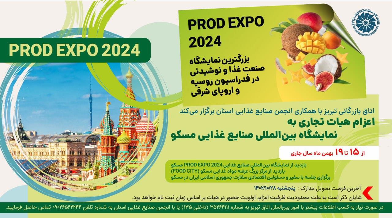 به اطلاع اعضای محترم میرساند، اتاق تبریز با همکاری انجمن صنایع غذایی، دارویی و بهداشتی استان، در نظر دارد، هیاتی متشکل از بازرگانان و صاحبان صنایع را از تاریخ 15 لغایت 19 بهمن ماه سال جاری، جهت بازدید از نمایشگاه بین المللی صنایع غذایی PROD EXPO 2024 مسکو که بزرگترین نمایشگاه صنعت غذا و نوشیدنی در فدراسیون روسیه و اروپای شرقی است به کشور فدراسیون روسیه اعزام کند.