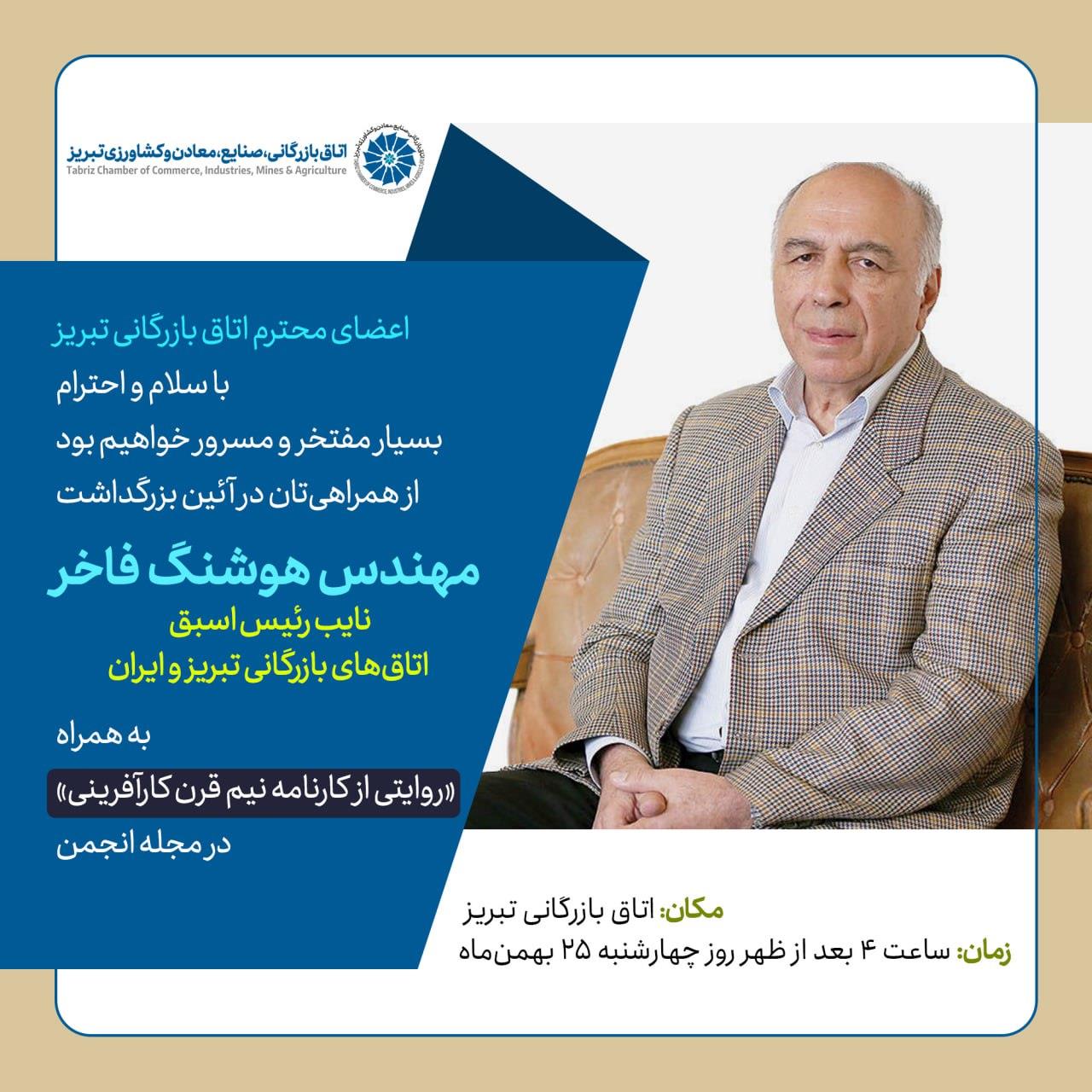 به گزارش روابط عمومی اتاق بازرگانی تبریز، آیین تجلیل از هوشنگ فاخر، نایب رئیس اسبق اتاقهای بازرگانی تبریز و ایران، روز چهارشنبه 25 بهمن 1402 ساعت 16 در محل اتاق بازرگانی تبریز برگزار میشود.