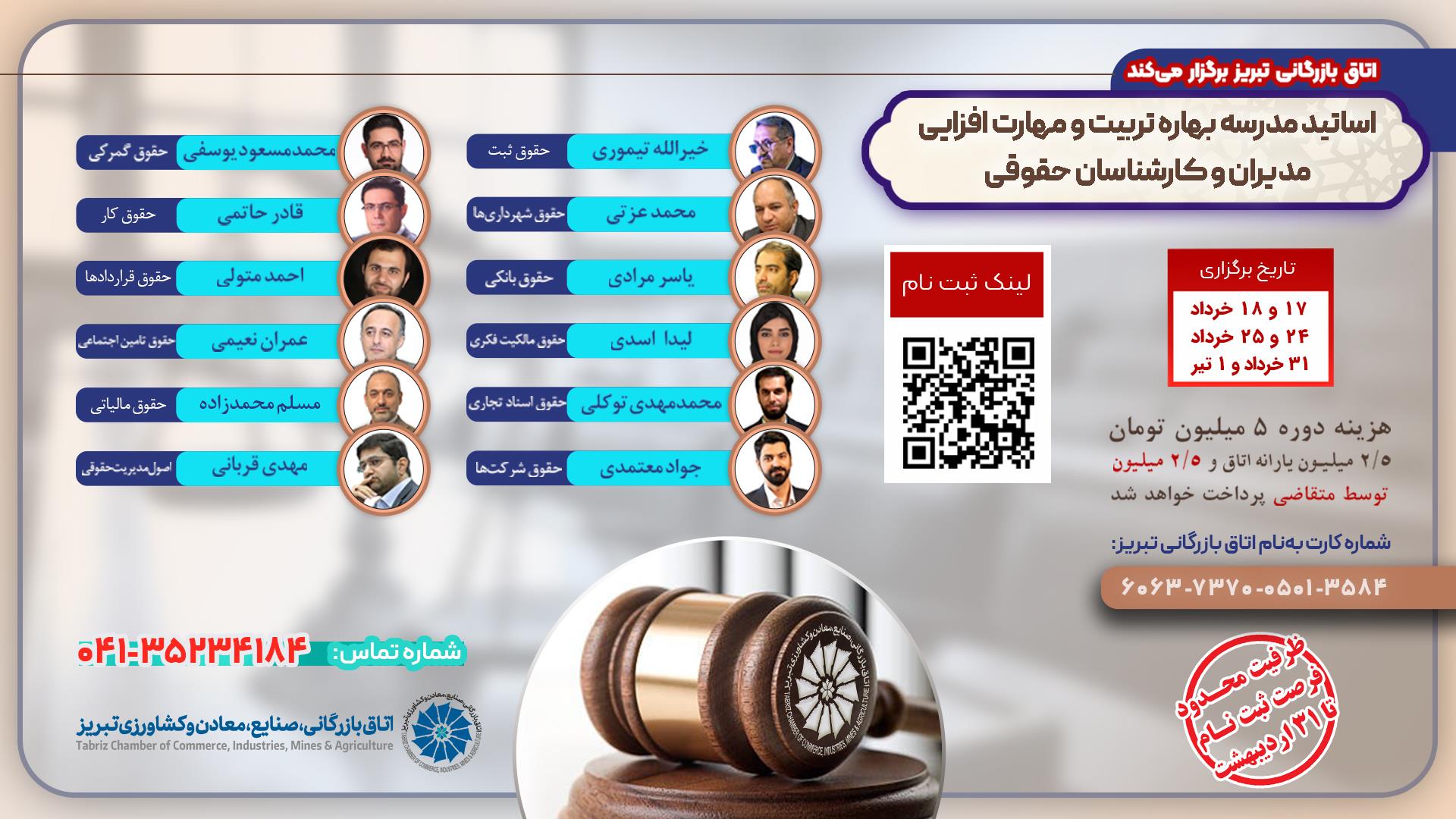اتاق بازرگانی، صنایع، معادن و کشاورزی تبریز در راستای ارتقاء دانش و مهارتهای مدیران و کارشناسان حقوقی، "مدرسه بهاره تربیت و مهارتافزایی مدیران و کارشناسان حقوقی" را بهصورت حضوری و آنلاین برگزار میکند.