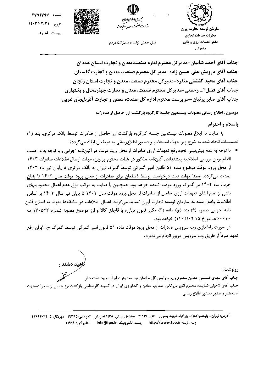 همچنین با عنایت به مراتب فوق عدم اعمال محدودیت‌های ناشی از عدم ایفای تعهدات ارزی حاصل از صادرات از محل ورود موقت سال ۱۴۰۲ تا پایان تیر سال ۱۴۰۳ بر اساس اطلاعات واصل شده به سازمان توسعه تجارت ایران تمدید می‌شود.