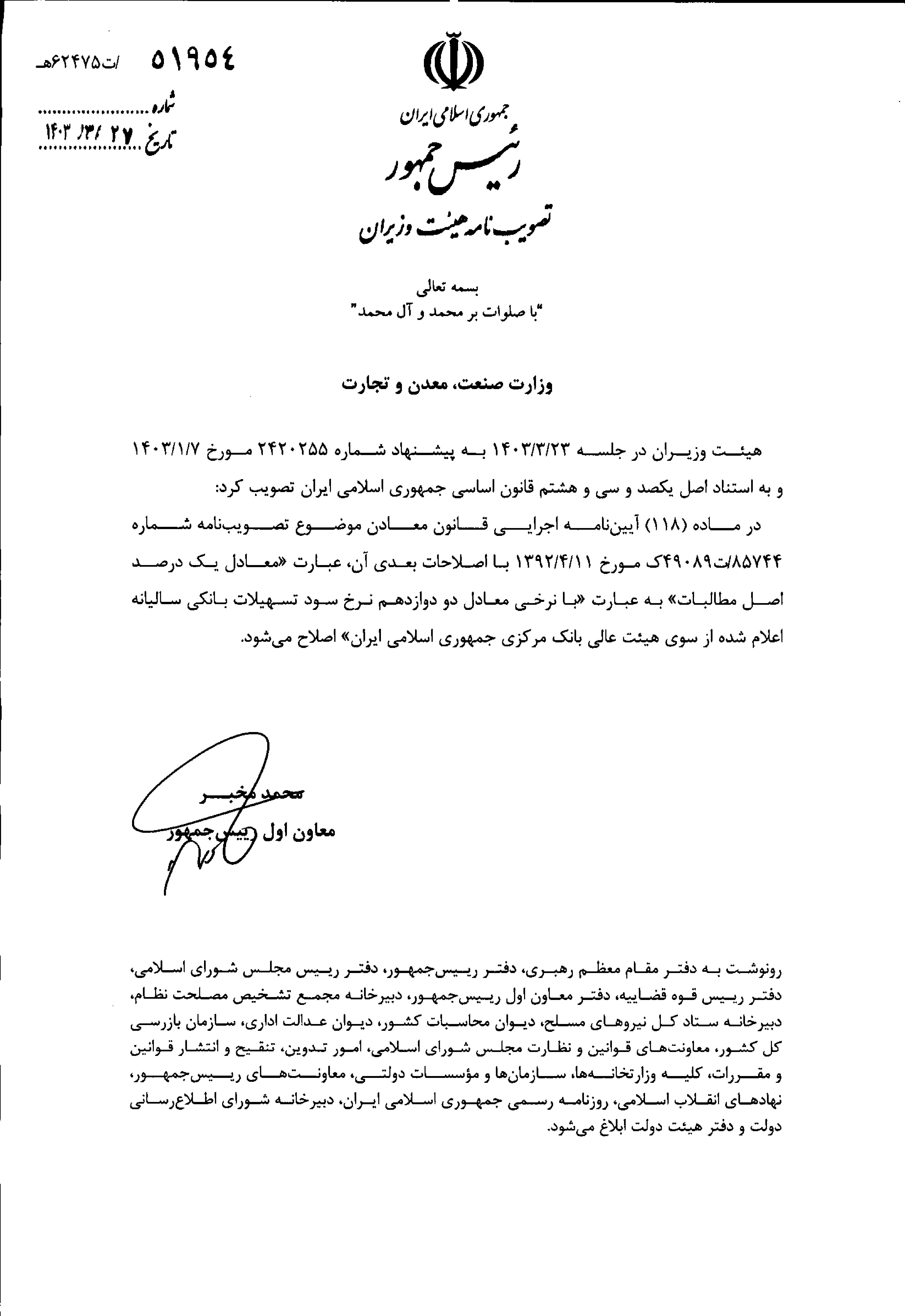 بر اساس تصویب هیئت وزیران در خصوص تبصره ماده (118) آییننامه اجرایی قانون معادن، عبارت "معادل یک درصد اصل مطالبات» با عبارت با نرخ «معادل دو دوازدهم نرخ سود تسهیلات بانکی سالیانه اعلام شده از سوی هیئت عالی بانک مرکزی جمهوری اسلامی ایران" اصلاح میشود.