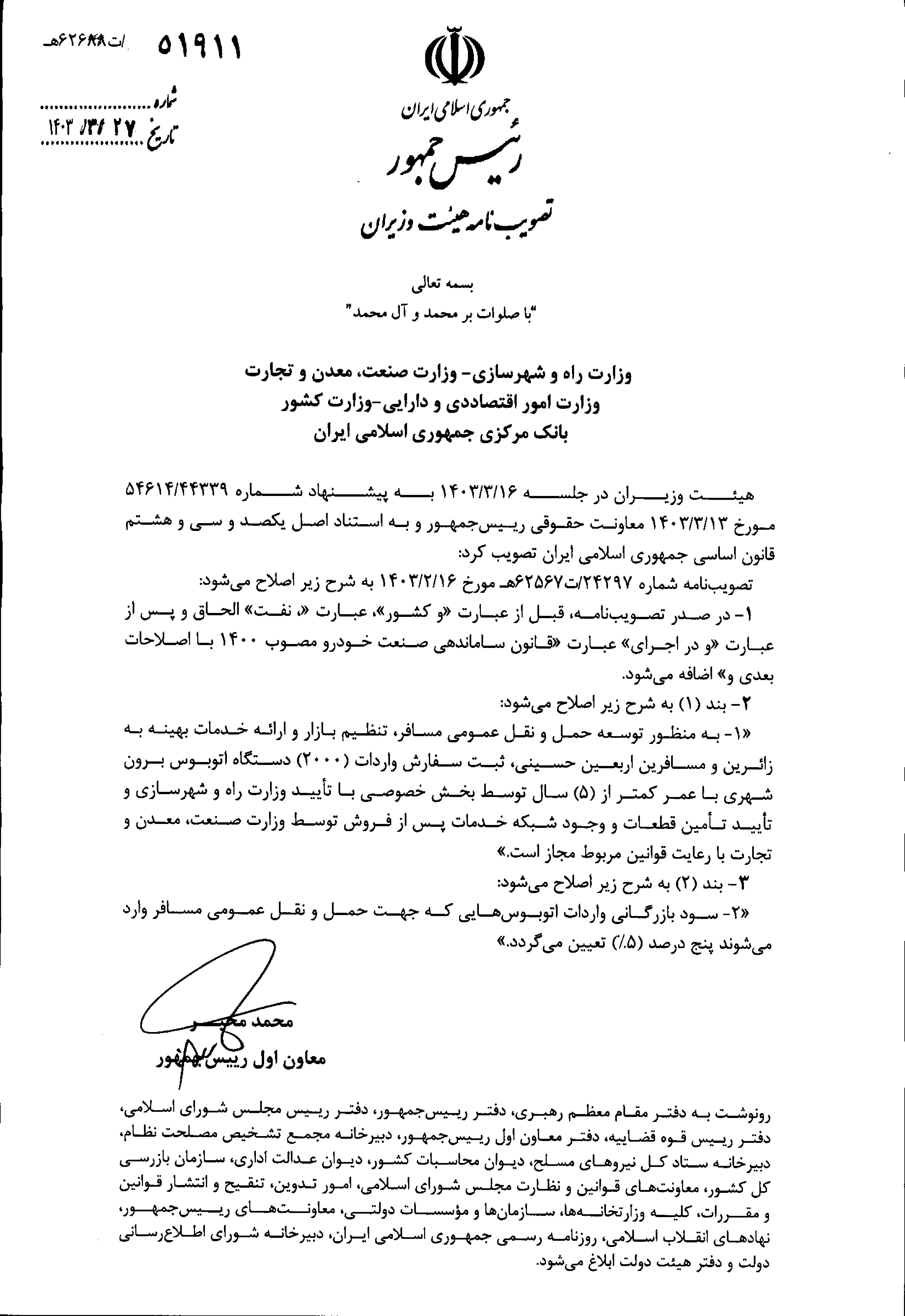 تصویبنامه هیئت وزیران در خصوص ثبت سفارش واردات اتوبوس برون شهری
