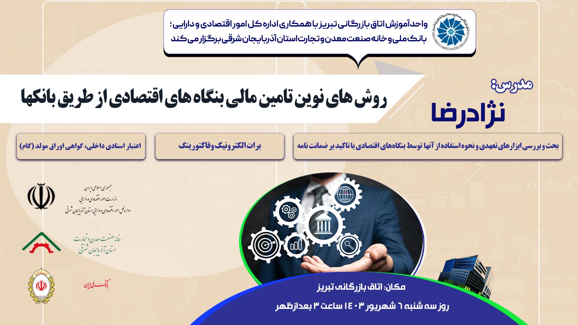 واحد آموزش اتاق بازرگانی تبریز با همکاری اداره کل امور اقتصادی و دارایی، بانک ملی و خانه صنعت، معدن و تجارت استان آذربایجان شرقی، دوره آموزشی «روشهای نوین تأمین مالی بنگاههای اقتصادی از طریق بانکها» را برگزار میکند.