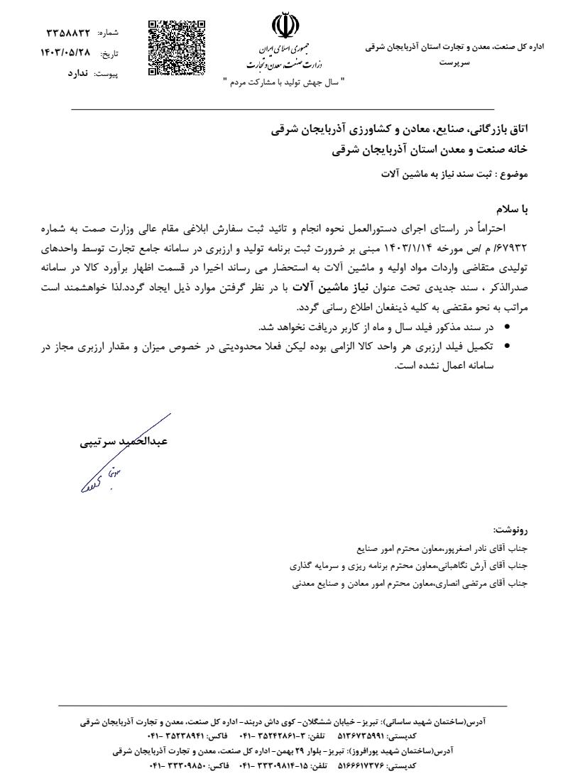 بر اساس اعلام اداره کل صمت استان، مبنی بر ضرورت ثبت برنامه تولید و ارزبری در سامانه جامع تجارت توسط واحدهای تولیدی متقاضی واردات مواد اولیه و ماشین‌آلات، به استحضار می رساند اخیرا در قسمت اظهار برآورد کالا؛ در سامانه صدر الذكر، سند جدیدی تحت عنوان نیاز ماشین‌آلات با در نظر گرفتن موارد ذیل ایجاد شده است. بنابراین در سند مذکور فیلد سال و ماه از کاربر دریافت نخواهد شد و تکمیل فیلد ارزبری هر واحد کالا الزامی است، لیکن فعلا محدودیتی در خصوص میزان و مقدار ارزبری مجاز در سامانه اعمال نشده است.