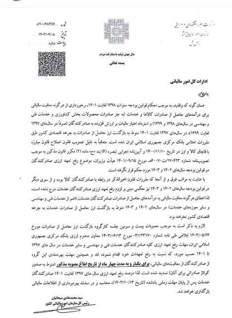 لازم به ذکر است به موجب مصوبات بیست و سومین جلسه کارگروه بازگشت ارز حاصل از صادرات مورخ ۱۴۰۳/۰۵/۲۴ ابلاغی طی نامه شماره ۳/۱۳۳۱۷۰ مورخ ۱۴۰۳/۰۶/۱۳ معاون محترم ارزی بانک مرکزی جمهوری اسلامی ایران مهلت رفع تعهد ارزی کلیه صادر کنندگان خدمات فنی و مهندسی و سایر خدمات در سال‌های ۱۳۹۷ تا ۱۴۰۱ حسب مورد، که نسبت به رفع تعهدات خود اقدام ننموده‌اند و همچنین مهلت بهره‌مندی این گروه از صادر کنندگان از معافیت‌های مالیاتی برای یکبار و به مدت چهار ماه از تاریخ ابلاغ مصوبه مذکور منوط به صدور کوتاژ صادراتی برای آنان تمدید شده است. لذا درصد رفع تعهد ارزی سال‌های ۱۳۹۷ لغایت ۱۴۰۱ صادر کنندگان خدمات پس از پایان مهلت زمانی یادشده (تاریخ ۱۴۰۳/۱۰/۱۳)، محاسبه و در سامانه بهره برداری از اطلاعات مالیاتی بارگذاری خواهد شد.»