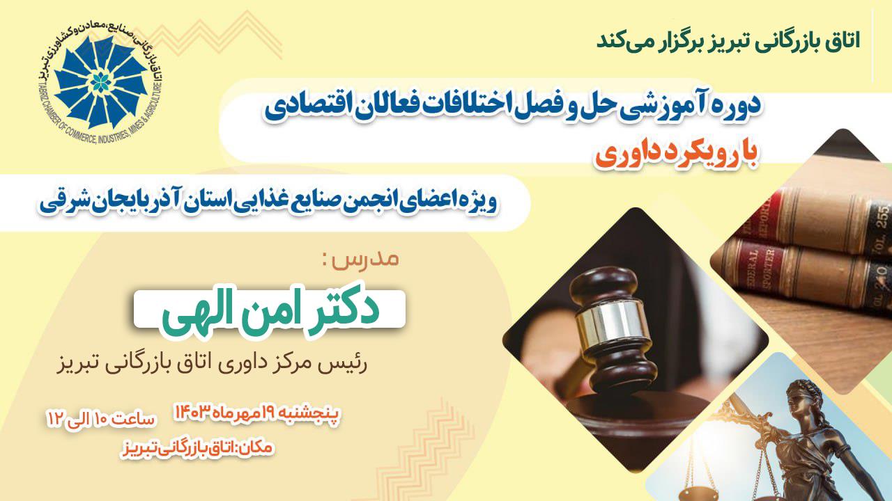 دوره آموزشی حل و فصل اختلافات فعالان اقتصادی با رویکرد داوری، ویژه اعضای انجمن صنایع غذایی استان آذربایجانشرقی، از ساعت ۱۰ الی ۱۲ صبح روز پنجشنبه ۱۹ مهرماه ۱۴۰۳ در اتاق بازرگانی تبریز برگزار می شود.