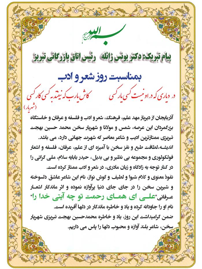 آذربایجان از دیرباز مهد علم، فرهنگ، شعر و ادب و فلسفه و عرفان و خاستگاه بزرگمردان این عرصه، شمس و مولانا و شهریار سخن محمد حسین بهجت تبریزی ممتازترین ادیب و شاعر معاصر که شهرت جهانی دارد، می باشد. اندیشـه،لطافت طبع و نغز سخن با آمیزه ای از علم، عرفان، فلسفه و اشعار فولکولوری و مجموعه بی نظیر و بی بدیل، حیدر بابایه سلام، ملی گرائی را در کنار توجه به زادگاه و زبان مادری، در شعر و ادب ممتاز کرده است. نفوذ معنوی و کلام شیوا و لطیف و گوش نواز، نام این شاعر عاشق دلسوخته و شیرین سخن را در جای جای دنیا پرآوازه نموده و اثر ماندگار اشعـار عـرفانی”علـی ای همـای رحمت تو چه آیتی خدا را” نام او را جاودانه کرده و یاد و خاطره ماندگار در دلها آفریده است. ضمن گرامیداشت این روز، یاد و خاطره محمدحسین بهجت تبریزی شهریار سخن، شاعر بلند آوازه و محبوب دلها را پاس می داریم.