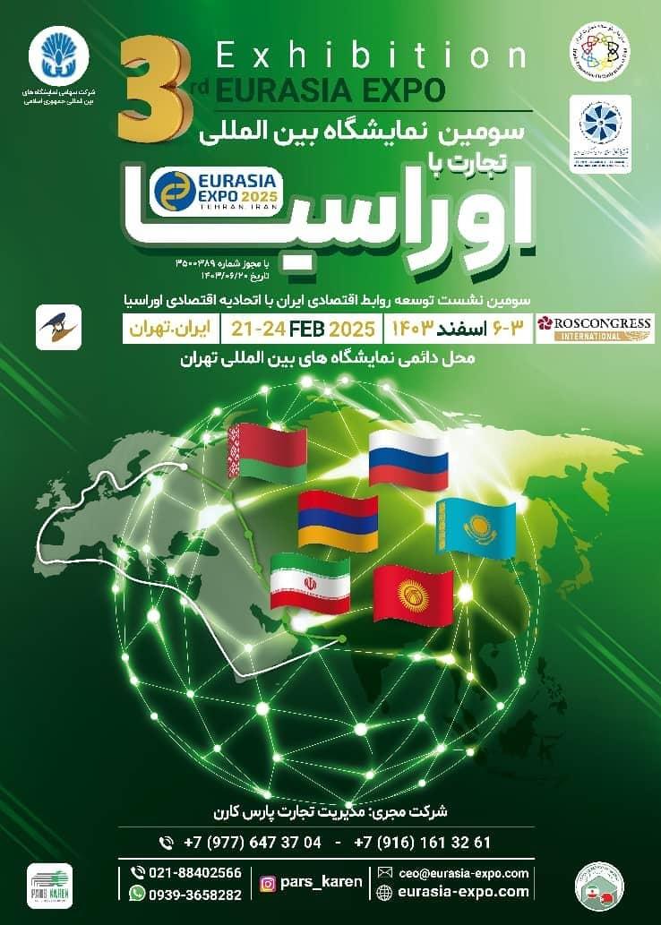 اتاق تهران و سازمان توسعه تجارت ایران، سومین همایش و نمایشگاه بین‌المللی تجارت با اوراسیا را در تاریخ ۳ تا ۶ اسفندماه ۱۴۰۳ در محل دائمی نمایشگاه‌های بین‌المللی تهران برگزار می‌کنند.