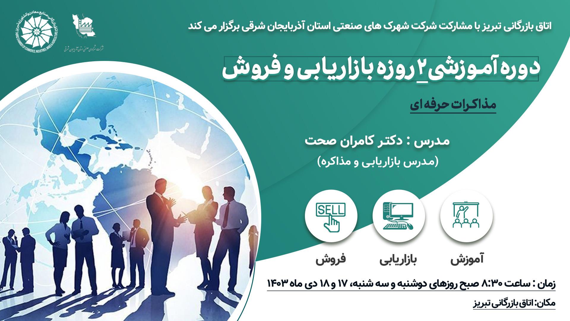 دوره آموزشی ۲ روزه بازاریابی و فروش (مذاکرات حرفهای) با مشارکت اتاق بازرگانی تبریز و شرکت شهرکهای صنعتی استان آذربایجانشرقی برگزار میشود.